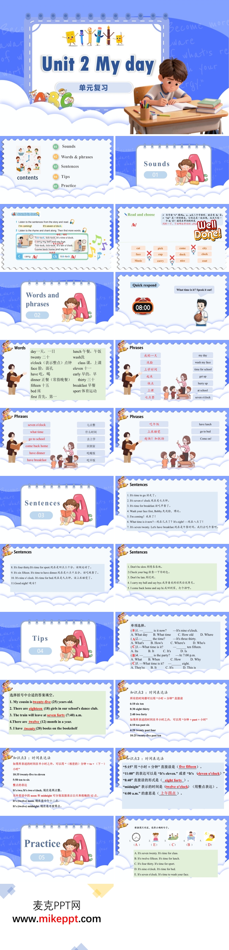 这份29页的PPT围绕译林版四年级上册Unit 2《My day》展开,以“会说一天、说好一天、说精一天”为总目标,用游戏化、情境化、合作化的方式层层推进。课堂伊始,教师启动“快问快答”热身游戏:屏幕上随机闪现get up, have breakfast, go to school, do homework等日常活动剪影,学生需在3秒内大声喊出短语并配动作,答对即可触发“小太阳”旋转动画,瞬间激活课堂氛围,同时帮助学生建立词汇与动作的直接链接,降低母语转换成本。随后进入“小组拼图对话”环节:每组领取一套缺句的“一天流程图”,成员须在限定时间内用英文补齐空缺并分角色朗读,如A: When do you get up? B: I get up at seven. 朗读完毕,教师用手机扫码实时投屏,全班用表情符号为最佳合作小组点赞,既锻炼口语,又强化团队协作。为突破“频率副词”这一语法难点,PPT创设“小明的一周”大情境:周一到周日的时间轴上,不同活动以不同颜色呈现,教师引导学生用always, usually, often, sometimes, never描述差异,如“I usually play football on Tuesday, but I never watch TV on school days.”学生先个体思考,再两人互查,最后推选“频率小达人”上台用激光笔指图说句子,台下同学齐做手势表示认同或纠错,实现全班互动。语音板块,课件先播放一段含/i:/ /ɪ/ 对比的听力材料,学生拖拽单词到对应音标桶,系统自动播放“叮咚”或“再试一次”反馈;随后出现“节奏chant”:Get-up, wash-up, breakfast-time, go! 学生边拍手边模仿,感受重读与连读,培养良好语感。时间表达法部分,教师用“钟表转盘”游戏强化“past & to”结构:指针随机停在7:10,学生须快速说出“It’s ten past seven.”答对即可为小组赢得“时间币”,累计最多者可优先选择课后拓展任务。练习与巩固环节设置三层任务:①图文匹配——把散落的短语贴回对应时间段;②句型转换——把“I get up at six.”改为一般疑问句并作答;③情境写话——根据提供的“Tom’s Tuesday”关键词写5句话,鼓励加入频率副词。知识小结时,学生跟随“一天手势操”齐背核心句型,边做动作边回忆,加深记忆。作业设计体现梯度:基础层——跟读课文录音并上传;提升层——拍摄60秒vlog,用英文介绍“My Wednesday”;拓展层——设计“理想的一天”海报,用至少5个频率副词描述,下节课举行“最佳日程规划师”评选。整套PPT画面明快、节奏紧凑,既夯实词汇句型,又提升语用能力,让四年级孩子在“说一天”的过程中体验英语学习的成就感与自主感。