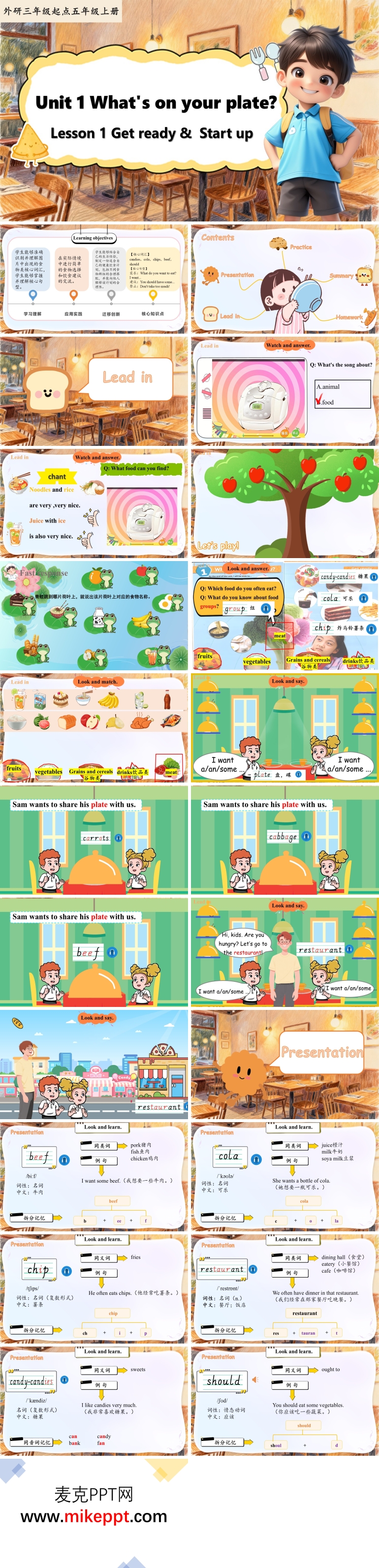 这套共47页的PPT课件,围绕外研版五年级上册Unit 1第1课时“Get ready & Start up”展开,是一节集词汇、句型与情境体验于一体的综合操练课。设计者采用“情景教学法”贯穿始终,借助真实可感的画面与任务,让学生仿佛置身于英语国家的日常生活场景,从而激活表达欲望、降低语言焦虑。课件开篇用一张“时光隧道”动图引导学生从“现在”穿越到“过去”,自然引出life, different, ago, radio, television, telephone, washing machine等重点词汇;教师先让学生观察对比“旧时客厅”与“现代客厅”两幅高清图,用“Look and say”抢答方式快速输出“There was/wasn’t…”“We’ve got…”等结构,图片差异越明显,学生情绪越高涨,词汇记忆也随之加深。句型板块聚焦“Don’t take too much.”这一功能句,教师创设“自助餐厅”情境:屏幕上的卡通餐桌不断跳出bread, rice, meat, vegetables,学生两人一组轮流扮演“提醒者”与“取餐者”,用目标句型实时互动,系统根据音量与准确度给出“点赞”或“再来一次”的即时反馈,既操练祈使句,又渗透健康饮食教育。为了巩固“too much / too many”易混点,课件嵌入“分类垃圾桶”小游戏:学生把可数与不可数名词拖拽到对应桶内,若分类正确垃圾桶会“张嘴吃掉”并播放欢呼音效,错误则弹出“再想想”提示,游戏中难点迎刃而解。练习环节分三层推进:基础层“图文配对”检测词义;提升层“对话排序”还原餐厅提醒场景;拓展层“设计理想自助餐桌”——学生用至少五句话描述并口头呈现,教师依据“词汇丰富度、语用准确度、创意指数”三维量表现场评星,优胜组获得“健康小达人”徽章。课堂总结以“时光对比秀”收尾:学生用所学词汇与句型,一人一句描述“爷爷的童年”与“我的童年”,在集体齐诵中结束本课。作业设计延续情境:基础层——跟读录音并上传;提升层——拍摄30秒英文vlog,提醒家人“Don’t take too much at dinner”;拓展层——采访长辈童年生活用品,用英语写3句对比句,下节课举行“时光博物馆”分享。整套课件画面清新、节奏明快,既夯实语言知识,又培养文化意识与思维品质,让五年级孩子在沉浸式体验中轻松迈出单元学习第一步。