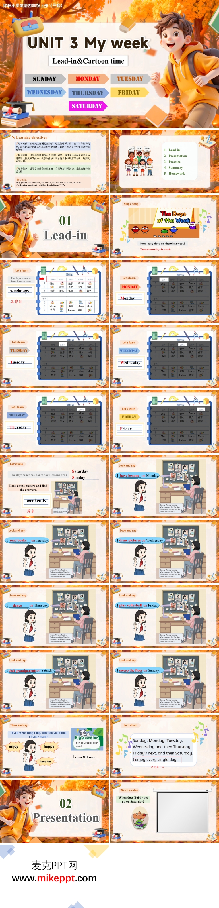 这套44页的Cartoon time教学课件,为译林版四年级上册Unit 3第1课时量身打造,核心任务是把“星期+活动”词汇与句型“Would you like…?”“Yes, please./No, thanks.”融进真实对话,实现从“会背”到“会用”的跨越。开篇“学习理解”板块,先播放90秒卡通《A Week in the Park》:Sarah逐一向朋友发出“Would you like to play football on Saturday?”等邀请,学生带着“谁答应了、谁拒绝了”的问题无字幕观看,第二遍逐句停顿,聚光灯高亮目标句型,教师用表情贴图示范“愉快接受”与“礼貌拒绝”的语调差异,学生跟读并做“握手接受/摆手拒绝”动作,音、形、义瞬间同步。进入“小组展示”环节,课件推出“公园邀约大转盘”:指针停在“Tuesday—fly kites”“Thursday—go skating”等随机组合,四人小队须在60秒内编出4轮邀请—回应对话,并用头饰道具上台配音,教师依据“语言准确度、合作默契度、创意表演度”三维量表现场评星,优胜组获得“Cartoon Star”徽章,课堂气氛瞬间爆棚。“句型操练”部分设置分层任务:基础层“单图单句”——拖拽食物或活动图标补全“Would you like…?”;提升层“双图对比”——选择接受或拒绝并给出理由;拓展层“连环邀请”——连续发出三个邀约,对方需做出不同回应,系统即时播放“点赞”或“再想想”音效,精准巩固。总结环节,学生齐做“邀请手势操”,一边比“递盘子”动作一边齐背“Would you like…? Yes, please. No, thanks.”在律动中加深记忆。家庭作业延续情境:基础层——跟读录音并上传;提升层——拍摄30秒英文短片,用目标句型向家人发出三次邀约;拓展层——设计“理想周末计划”海报,用至少五句邀请句型书写,下节课开展“最佳邀约王”评选。整套课件画面活泼、节奏明快,既夯实语言知识,又渗透礼貌交际意识,让四年级孩子在卡通世界里学会真诚邀请、得体回应,真正实现“学中用、用中乐”。