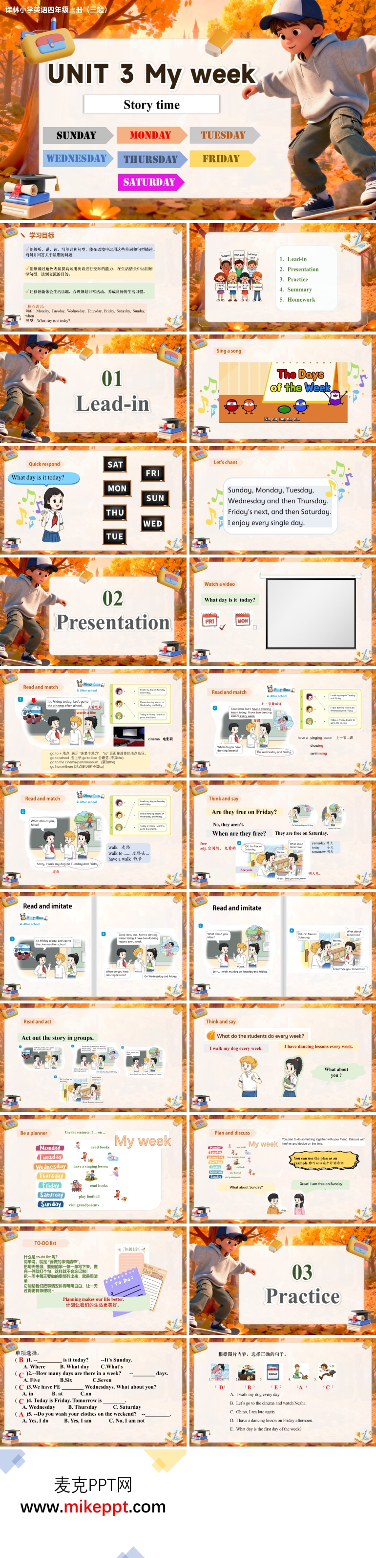这套共30张幻灯片的Story time教学课件,紧扣译林版四年级上册Unit 3第2课时,以“讲故事”为主线,将语言知识镶嵌于生动情节之中,引导学生在“听故事—读故事—讲故事—创故事”的层层递进中,自然掌握数字13-19及整十的拼写规律,并灵活运用核心句型“How many…do you have?”进行真实交流。开篇“目标导航”明确三维任务:语言目标——准确认读并书写thirteen至nineteen及twenty;技能目标——借助故事地图提取信息、组织语言;情感目标——体验分享与助人的快乐。接着进入“数字拼读坊”:课件以“森林集市”背景,让兔子卖家依次摆出13根胡萝卜、15颗蘑菇、18个松果,学生通过观察“-teen”与“-ty”的形音差异,跟读并用手势拼写,系统即时播放“叮咚”或“再试试”反馈,帮助其建立清晰的拼写范式。故事环节播放动画《The Lost Nuts》:小松鼠先后询问山羊、刺猬“How many nuts do you have?”最终凑齐20粒丢失的坚果,学生在观看过程中完成“数字信息卡”填写,训练抓关键数字的听力策略。随后展开“小组故事接龙”:每组领取一幅故事拼图,须用目标句型创编对话并加入新角色,如“How many apples do you have, Mr. Fox?”教师依据“语言准确度、创意度、合作度”三维量表现场评星,优胜组获得“Story Star”徽章,课堂气氛高潮迭起。巩固练习分三层:基础层——图文配对将数字与数量对应;提升层——补全对话并圈出正确数字;拓展层——设计“我的宝藏袋”海报,用至少五句“How many…do you have?”采访同学并记录,下节课举行“宝藏分享会”。整套课件画面清新、节奏紧凑,既夯实数字词汇与句型,又培养故事思维与合作意识,让四年级孩子在讲故事的乐趣中实现语言与情感的双重生长。