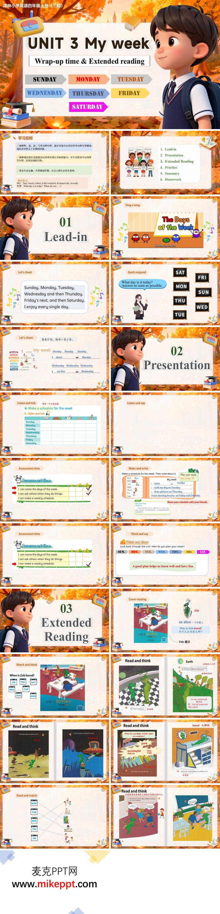 这套36页的Wrap-up & Extended reading课件,为译林版四年级上册Unit 3第3课时收官课量身定制,以“会读、会找、会说、会整理”四级目标,把词汇、句型与阅读策略融进一个完整的“书包探秘”情境,让学生在游戏与合作的节奏中完成单元知识体系的建构。导入环节先亮出“神秘书包”360°旋转图,学生用“What’s in your schoolbag?”抢答,点击后飞出schoolbag、pen、pencil、eraser等单词卡片,系统即时评分,旧词迅速唤醒。接着播放自编儿歌《Week & Bag》——“Monday, pencil case; Tuesday, story books…”旋律套用《Are you sleeping?》,学生边唱边拍打节奏,在歌声中复现星期与物品双线词汇,为后续阅读热身。阅读部分采用“两步走”:先略读短文《Tom’s Blue Schoolbag》,用30秒抓主旨——“Why is Tom unhappy?”再寻读定位关键词,把school things与weekdays连线,完成“阅读寻宝卡”,每找对一个即可为小组赢得“Sharp-eye徽章”,在竞赛中训练扫读与跳读技巧。情境教学紧随其后:教师布置“理想书包”任务,四人小组用所给句型“On… I put… in my bag.”轮流介绍,并说明理由,教师依据“内容丰富、语音准确、合作默契”三维量表现场评星,优胜组获得“Pack Star”称号,课堂气氛瞬间爆棚。Practice and summary分三层:基础——图文配对;提升——对话缺词填空;拓展——设计“太空书包”海报,用至少五句“What’s in your schoolbag?”采访同伴并记录,下节课举行“宇宙展示会”。作业延续情境:基础层抄写并配图;提升层拍30秒视频介绍自己的bag;拓展层采访家长童年书包,用三句英文对比,上传班级云相册。整套课件画面清新、节奏明快,既系统梳理单元知识,又培养阅读策略与团队协作,让四年级孩子在“书包探秘”的趣味旅程中实现语言与思维的双重提升。