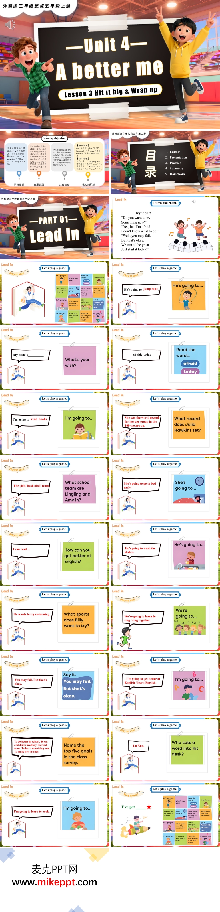 本套 PPT 模板聚焦于 Unit 4 第 3 课时 “Hit it big & Wrap up” 的重点学习内容,共包含 55 张幻灯片。其核心目标是帮助学习者深入理解并掌握相关知识。首先,学习者需要理解短语 “hit it big” 的含义及其在语境中的用法,并能够结合具体情境进行翻译和运用。同时,学习者还需熟练掌握单元核心句型:“I can...”“I want to be...”“I will... to be a better me.”,并能在对话中灵活运用这些句型。 此外,PPT 模板还注重对单元核心词汇的回顾与巩固,包括 “better”“fast”“high”“far”“strong”“healthy”“hard”“practice” 等词汇,帮助学习者进一步熟悉这些单词的词形和词义,从而加深对单元整体内容的理解。 PPT 模板通过 PowerPoint 软件分为五个部分。第一部分是 Lead-in(情境导入),这是整个学习流程的开端,通过将单词置于具体情境中,帮助学习者更好地理解单词的实际应用,为后续学习奠定基础。第二部分是 Presentation(知识呈现),通过清晰、有条理的内容展示,帮助学习者系统地掌握重点知识。第三部分是 Practice(强化练习),遵循 “实践出真知” 的学习规律,通过多样化的练习形式,帮助学习者巩固已学知识。只有通过反复强化和及时应用,才能将短时记忆转化为长效记忆,真正实现对单词的灵活运用。第四部分是 Summary(总结提炼),引导学习者梳理整个学习过程中的核心要点、高效学习方法以及易错点,帮助学习者总结经验,提升学习效率。最后一部分是 Homework(拓展巩固),作为学习闭环的收尾环节,通过布置拓展性作业,帮助学习者进一步巩固所学知识,最终达成 “学以致用” 的核心目标。 通过这样的结构设计,PPT 模板为学习者提供了一个系统、高效的学习框架,有助于提升学习者对重点单词和句型的掌握能力,同时培养其在实际语境中运用语言的能力。