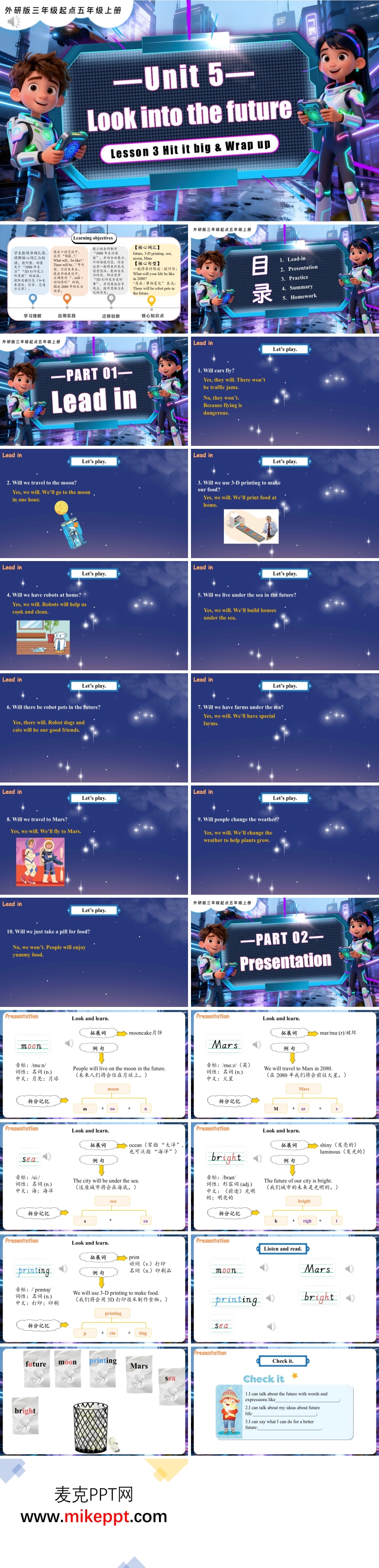 本套 PPT 模板专注于 Unit 5 第 3 课时 “Hit it big & Wrap up”,通过 45 张幻灯片的设计,旨在深化学生对“未来”主题的理解与表达能力。其中,“Hit it big” 情境对话通过生动的情境设置,帮助学生理解对话内容,掌握关键短语如 “make a prediction” 和 “come true” 的用法,从而提升学生在真实语境中的语言运用能力。同时,“Wrap up” 部分则系统梳理了单元知识,使学生能够熟练运用核心句型,进一步巩固对单元内容的整体理解。 此外,PPT 模板还鼓励学生创编关于“未来梦想实现”的简短对话或演讲稿,这一环节不仅有助于提升学生的语言输出能力,还能激发他们的创造力和想象力,将所学语言知识转化为实际表达能力。 PPT 模板通过 PowerPoint 软件分为五个部分。第一部分是 Lead-in(情境导入),通过将单词置于具体情境中,帮助学生为后续学习筑牢基础,使单词学习不再孤立,而是与实际语境紧密结合。第二部分是 Presentation(知识呈现),通过清晰、有条理的内容展示,帮助学生系统地掌握重点知识,确保学习过程的连贯性和高效性。第三部分是 Practice(强化练习),遵循“实践出真知”的学习规律,通过多样化的练习形式,帮助学生巩固已学知识,确保知识的内化与应用。第四部分是 Summary(总结提炼),引导学生梳理整个学习过程中的核心要点、高效学习方法以及易错点,帮助学生总结经验,提升学习效率。第五部分是 Homework(拓展巩固),作为学习闭环的收尾环节,通过针对性的课后任务,帮助学生实现重点单词学习的进阶提升,最终达成“学以致用”的核心目标。 通过这样的设计,PPT 模板不仅为学生提供了一个系统、高效的学习框架,还通过情境对话和实践练习,帮助学生将语言知识转化为实际应用能力。这种学习方式不仅有助于学生掌握单元重点知识,还能提升他们的综合语言运用能力,为未来的学习和生活打下坚实基础。