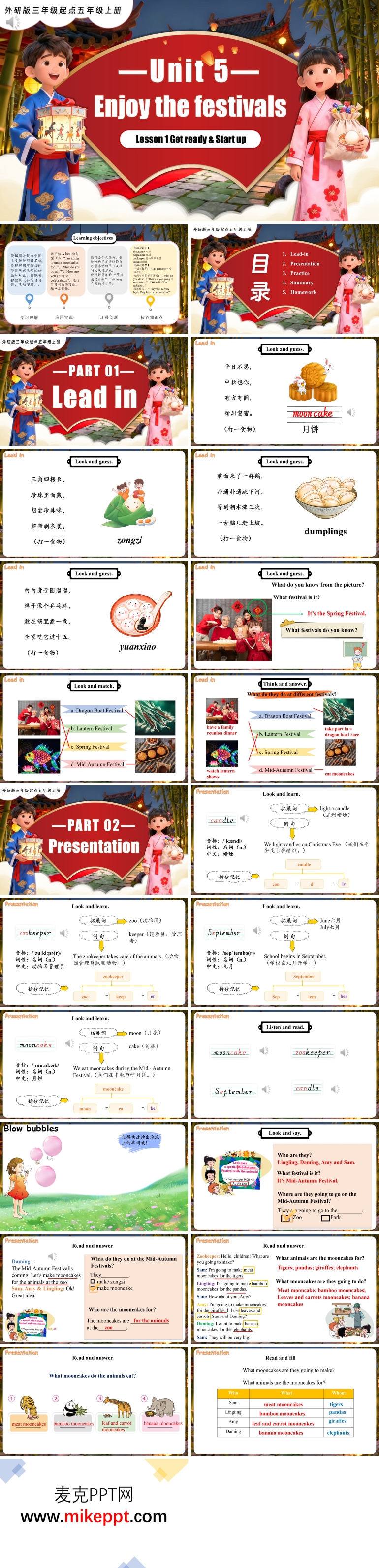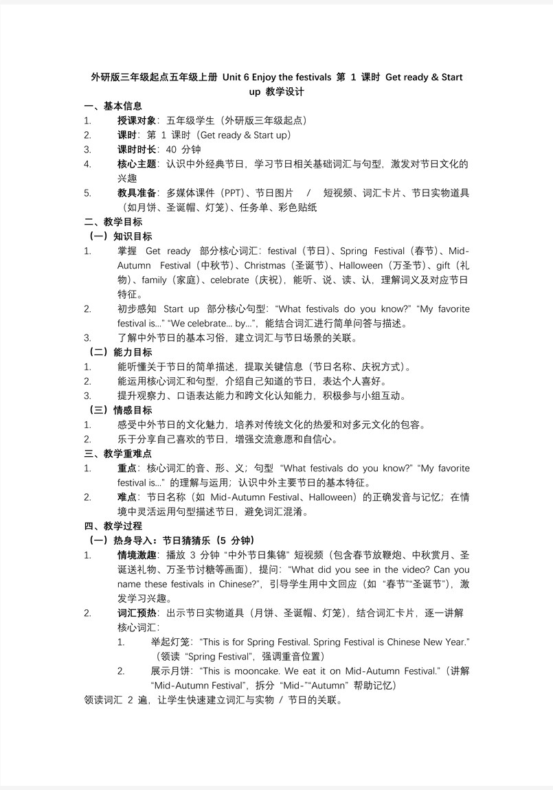 本套 PPT 模板针对小学英语 Unit 6 第 1 课时 “Get ready & Start up”,通过 42 张幻灯片详细介绍了中外经典节日,旨在通过学习节日相关词汇和句型,激发学生对节日文化的兴趣,帮助他们掌握核心词汇,并理解不同节日的特征。PPT 内容丰富,结构清晰,分为五个部分,为学生提供了一个系统的学习框架。 第一部分是 Lead-in(情境导入),这是整个学习过程的开端。通过将单词代入传统节假日的情景中,学生能够直观地感受到节日文化的魅力,从而激发他们的学习兴趣。这种情境导入的方式不仅帮助学生更好地理解单词的含义,还能让他们在轻松愉快的氛围中开启学习之旅。 第二部分是 Presentation(知识呈现),这一环节通过清晰、有条理的内容展示,帮助学生系统地学习与节日相关的基础词汇,如 “festival”“Spring Festival”“Mid-Autumn Festival”“Christmas”“Halloween”“gift”“family”“celebrate” 等。学生需要掌握这些词汇的听、说、读、认能力,并理解每个节日的独特特征。通过这一环节,学生能够逐步积累词汇量,为后续的语言输出打下坚实基础。 第三部分是 Practice(强化练习),这是学习过程中不可或缺的环节。通过多样化的练习形式,如填空、选择、对话练习等,学生能够不断强化记忆,将所学词汇和句型运用到实际语境中。这种“实践出真知”的学习方式,不仅帮助学生巩固知识,还能提升他们的语言运用能力,确保知识的内化与吸收。 第四部分是 Summary(总结提炼),这一环节引导学生对整个学习过程进行回顾和总结。在学习过程中,教师会帮助学生总结一些高效的学习方法和技巧,如记忆单词的策略、理解节日文化的要点等。通过总结,学生能够更好地梳理知识脉络,巩固学习成果,同时也能发现自己在学习过程中存在的问题,为后续学习提供方向。 第五部分是 Homework(拓展巩固),这是学习闭环的收尾环节。通过布置针对性的课后任务,如制作节日卡片、撰写节日小短文等,学生能够进一步巩固所学知识,将课堂学习延伸到课外。这些作业不仅能够帮助学生提升语言能力,还能激发他们的创造力和想象力,最终实现“学以致用”的目标。 此外,PPT 模板还注重培养学生的文化意识,通过介绍中外经典节日,帮助学生了解不同文化的节日习俗,激发他们对传统节日的认知和尊重。这种跨文化的学习方式不仅丰富了学生的知识储备,还能培养他们的国际视野和文化包容心态。 通过这样的设计,PPT 模板为学生提供了一个全面、高效的学习体验,帮助他们在轻松愉快的氛围中掌握重点词汇,提升语言能力,同时培养他们对节日文化的兴趣和热爱。