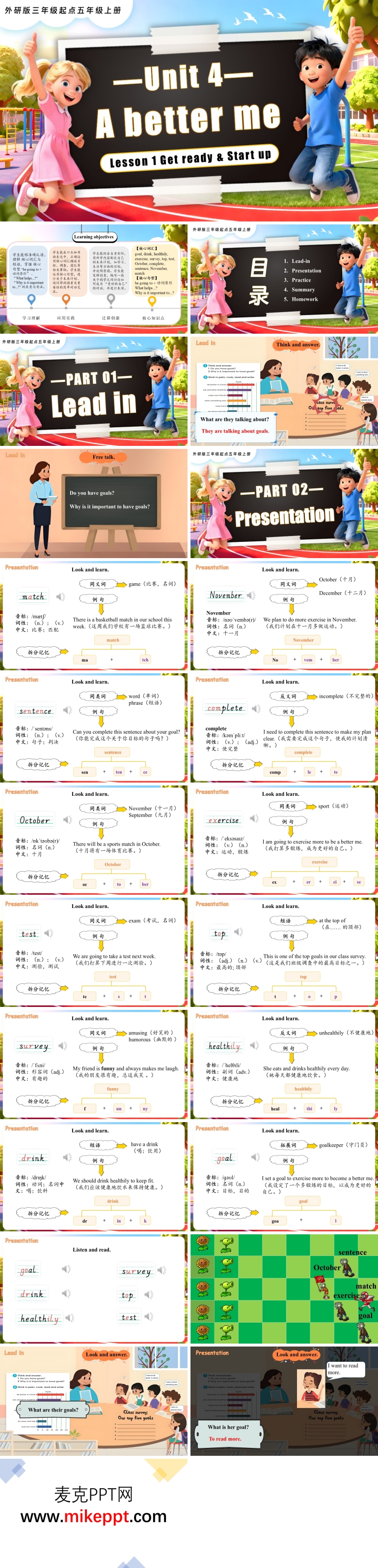 这是一套专为五年级英语上册 Unit 4 第 1 课时 “Get ready & Start up” 设计的 PPT 模板,属于外研社三起新教材的同步备课系列。该模板通过 PowerPoint 制作,包含 54 张幻灯片,旨在帮助学生学习描述个人品质的单词和句型,并能够熟练运用这些知识来描述自己或他人的品质。通过系统的教学设计,PPT 模板分为五个部分,全面覆盖了本节课的教学目标和内容。 第一部分是 Lead-in(情境导入)。这一部分通过展示有趣的图片,引导学生观察并交流图中人物的目标,从而自然地引入本节课的学习内容。这种情境导入方式能够激发学生的学习兴趣,使他们快速进入学习状态,为后续学习奠定良好的基础。 第二部分是 Presentation(知识呈现)。该部分系统地展示了本节课的新单词,包括它们的近义词和反义词,并通过例句帮助学生更好地理解和运用这些词汇。为了增加趣味性和互动性,PPT 还引入了“植物大战僵尸”这一广受欢迎的游戏元素,引导学生在游戏中巩固新学单词。此外,该部分还重点讲解了本节课的核心句型,通过多种教学手段帮助学生掌握句型结构和用法。 第三部分是 Practice(强化练习)。这一部分首先对本节课涉及的语法知识进行了简单介绍,帮助学生梳理语法要点。随后,通过设计多样化的练习活动,如填空、选择、造句等,引导学生完成相关练习,进一步巩固所学知识。这些练习不仅帮助学生加深对单词和句型的理解,还能提升他们的语言运用能力。 第四部分是 Summary(总结提炼)。在这一环节,教师引导学生回顾本节课的重点内容,包括新单词、句型和语法知识。通过总结,学生能够梳理知识脉络,巩固学习成果。同时,教师还可以根据学生的反馈,对易错点和难点进行再次强调,确保学生对知识的全面掌握。 第五部分是 Homework(拓展巩固)。作为学习闭环的收尾环节,这一部分通过布置有针对性的课后任务,帮助学生进一步巩固所学知识。作业形式多样,如书写小短文、制作单词卡片等,旨在鼓励学生将课堂所学延伸到课外,实现知识的深化和拓展。 通过这样的设计,PPT 模板为教师提供了一个清晰、高效的教学框架,同时也为学生创造了一个系统、有趣的学习体验。学生不仅能够掌握描述个人品质的单词和句型,还能通过多样化的教学活动提升语言运用能力和逻辑思维能力。这种教学方式不仅有助于学生在课堂上积极参与,还能激发他们对英语学习的持续兴趣,为后续学习打下坚实基础。