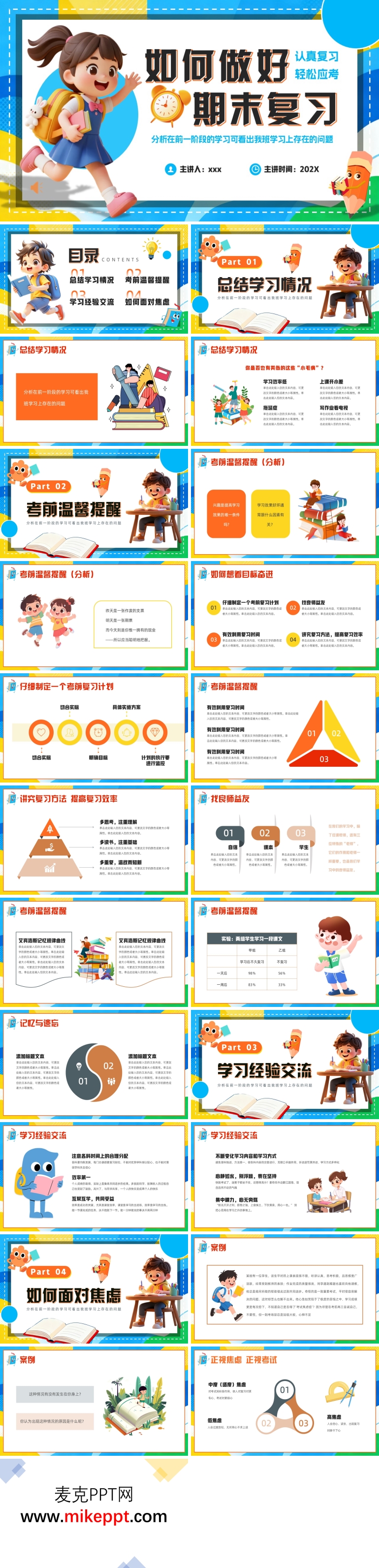 PPT模板内容主要通过PowerPoint软件分为四个部分。第一个部分总结自己的学习情况,只能根据自己的节奏和学习情况因地制宜的制定学习计划。第二个部分是考前温馨提醒。第三个部分是学习经验交流有助于汲取不同的经验。第四个部分是如何面对焦虑,需要建设良好的心态。复习就是不断加固你脑海里的知识“砖块”,让它变得牢固,不容易忘记。