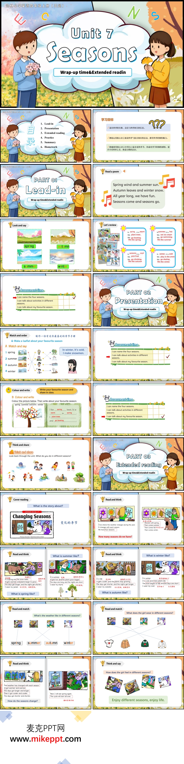 这是一套专为译林小学英语四年级上册(三起)Unit 7 第 3 课时 “Wrap-up time & Extended reading” 设计的 PPT 模板,通过 PowerPoint 制作,包含 30 张幻灯片。本节课的核心目标是引导学生学习有关季节的核心词汇和描述季节的相关句型,使学生能够在学完后灵活运用所学知识,描写自己喜欢的季节及其原因。通过系统的教学设计,PPT 模板分为六个部分,全面覆盖了本节课的教学目标和内容。 第一部分是 Lead-in(情境导入)。这一部分通过复习上节课的内容,帮助学生快速进入学习状态。通过回顾已学的季节词汇和句型,教师可以激活学生的已有知识,为新课内容的展开做好铺垫。这种复习导入的方式不仅能够巩固旧知识,还能自然地过渡到新内容的学习。 第二部分是 Presentation(知识呈现)。这一部分是本节课的核心环节,教师引导学生根据所学知识制作一份“最喜欢的季节”手册。学生需要运用所学的词汇和句型,描述自己最喜欢的季节及其原因,并通过绘画、书写等方式完成手册。完成手册后,学生将对自己的作品进行评分,这一过程不仅锻炼了学生的自主学习能力,还培养了他们的自我评价能力。 第三部分是 Extended Reading(拓展阅读)。这一部分通过引导学生阅读有关季节的绘本故事,进一步拓展学生的词汇量和语言表达能力。绘本故事不仅生动有趣,还能帮助学生学习更多关于季节的英文表达方式,拓宽他们的文化视野。通过阅读,学生能够更深入地理解季节的特征和相关文化背景。 第四部分是 Practice(强化练习)。这一部分主要引导学生完成与本节课相关的练习题,通过多样化的练习形式,帮助学生巩固所学知识。练习题包括词汇填空、句型转换、阅读理解等,旨在全面提升学生的语言运用能力。通过练习,学生能够进一步加深对季节词汇和句型的理解和记忆。 第五部分是 Summary(总结提炼)。在这一环节,教师引导学生回顾本节课的重点内容,包括核心词汇、句型以及拓展阅读中学到的表达方式。通过总结,学生能够梳理知识脉络,巩固学习成果。同时,教师可以根据学生的反馈,对易错点和难点进行再次强调,确保学生对知识的全面掌握。 第六部分是 Homework(拓展巩固)。作为学习闭环的收尾环节,这一部分通过布置有针对性的课后任务,帮助学生进一步巩固所学知识。作业形式多样,如撰写关于自己最喜欢的季节的小短文、制作季节主题的手抄报等,旨在鼓励学生将课堂所学延伸到课外,实现知识的深化和拓展。 通过这样的设计,PPT 模板为教师提供了一个清晰、高效的教学框架,同时也为学生创造了一个系统、有趣的学习体验。学生不仅能够通过制作手册、阅读绘本等方式巩固所学知识,还能通过多样化的教学活动提升语言运用能力和逻辑思维能力。这种教学方式不仅有助于学生在课堂上积极参与,还能激发他们对英语学习的持续兴趣,为后续学习打下坚实基础。