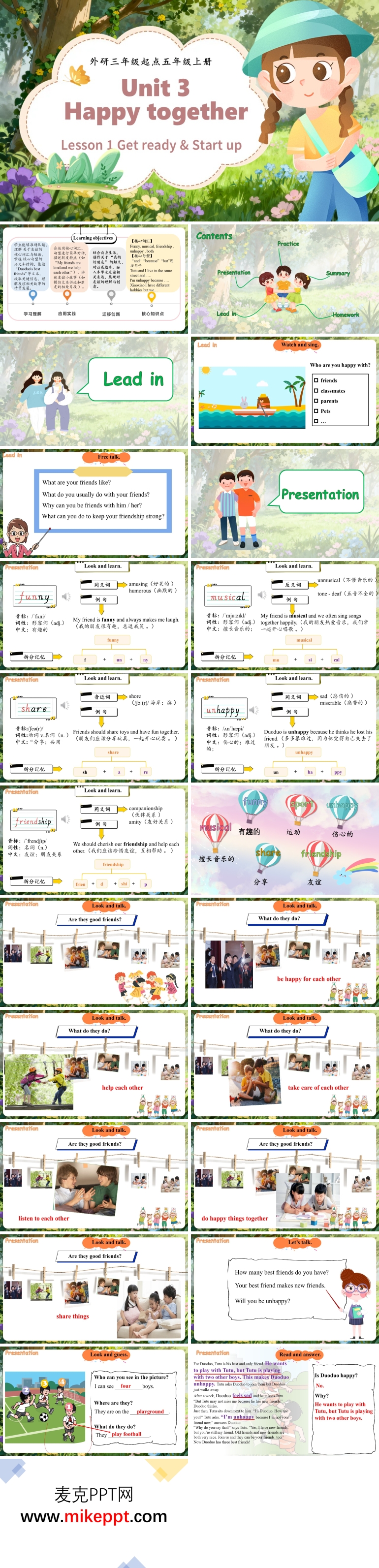 这套42页的PPT课件,为五年级英语上册外研版Unit 3第一课时“Get ready & Start up”量身定制。教案把“重点单词的灵活运用”与“核心句型的情境输出”并列为教学重点,将“在真实场景中完成自然、得体的日常对话”设为最大难点,要求学生在理解的基础上当堂背诵句型,为后续单元任务奠定“脱口而出”的语感基础。课件以“周末计划”为主线,通过“游戏—对话—阅读—迁移”四级阶梯,引导学生掌握go to the zoo, ride a bike, fly a kite, have a picnic等动词短语,以及“What are you going to do this weekend?”“I’m going to…”等be going to结构,实现“词汇—句型—语篇”的螺旋上升。 课堂流程共分六大板块。第一部分“Objectives & Highlights”用动画放大镜依次聚焦知识、技能、情感三维目标,让学生带着任务出发。第二部分“Lead-in”启动“快闪配对”游戏:屏幕随机闪现动词短语与图片,学生拍桌抢答,答对即可为小组能量条加油,30秒倒计时营造紧张氛围。第三部分“Free talk”进入两两对话,学生用“I’m going to…”向对方抛出周末计划,教师推送对话模板与表情贴纸,鼓励学生加入“sounds great”等自然回应,实现“句型+交际策略”双输入。第四部分“Language Focus”用“句型拆拆乐”动画把be going to结构分解成“主语+be+going+to+动词原形”五段,学生拖拽卡片重组句子,系统即时朗读正音,强化语法意识。第五部分“Text Time”呈现一篇题为“My Colourful Weekend”的小对话,学生先听音圈出计划活动,再分角色朗读,随后用“填空—复述—表演”三步法巩固内容。最后一部分“Homework”布置“Family Survey”:学生回家采访父母周末计划,用所学句型记录并上传30秒英文小视频,教师根据“流利度—准确度—创意度”颁发“Weekend Planner”电子勋章,徽章累计五枚可兑换“班级小主播”资格。42张幻灯片在“计划—分享—行动”的节奏中层层递进,让学生不仅“会说周末”,更“畅想周末”,把英语真正变成连接生活与期待的桥梁。