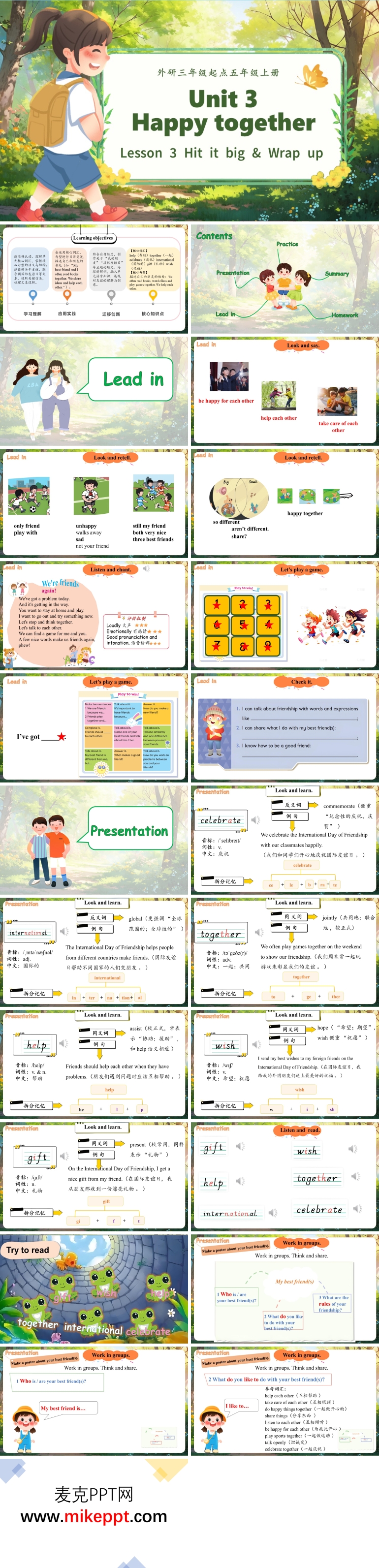 这套共40页的PPT课件,是为五年级英语上册外研版Unit 3第三课时“Hit it big & Wrap up”专门定制的“梦想主题”收官课。延续单元“周末计划—速度能量”情景线,本课把视野拉升到“人生蓝图”,核心任务是让每个学生都能用英语大声说出“I want to be…/I’m going to…”,并在同伴互动中树立“敢于追梦、乐于行动”的积极心态。课件以“Dream Elevator”故事轴展开:从“热身—游戏—句型—展示”四级台阶,引导学生把抽象的“dream”落地为可拆解、可分享、可行动的“my dream plan”。 课堂流程清晰分为五大板块。第一部分“Lesson Map”用一张“梦想电梯”概念图总览全课:1F热身、2F游戏、3F句型、4F展示、Top梦想发布,让学生一目了然“我们在哪一层、下一站去哪”。第二部分“Warm-up”播放30秒混剪短片《Kids’ Dreams》:小医生、小宇航员、小画家闪现登场,教师即时提问“What can you see?”学生用“I see a future…”抢答,激活主题词汇。第三部分“Play Game”进入“Dream Lottery”:学生转动轮盘抽取职业卡与理由卡(help others/creative/explore…),30秒内用“I want to be…because…”完成造句,挑战失败需唱一句“Be what you wanna be”,全班笑声与掌声齐飞。第四部分“Language Focus”采用“句型梯子”——教师拖拽单词块组合成“I’m going to practice…/read…/study…”,学生两两互读并替换动词短语,随后全班齐呼“Dream big, work hard!”将情绪推向高点。第五部分“Group Presentation”是输出高峰:四人战队把前面获得的职业卡、理由卡、行动计划卡贴成“Dream Poster”,用英语进行1分钟路演,教师依据“fluency—confidence—creativity”三维量表颁发“Dream Speaker”徽章,徽章最多的小组可获“班级梦想墙”C位展示权。40张幻灯片在欢呼与掌声中层层递进,让学生不仅“说出梦想”,更“相信梦想”,把英语课堂变成点燃未来的“梦想发射台”。