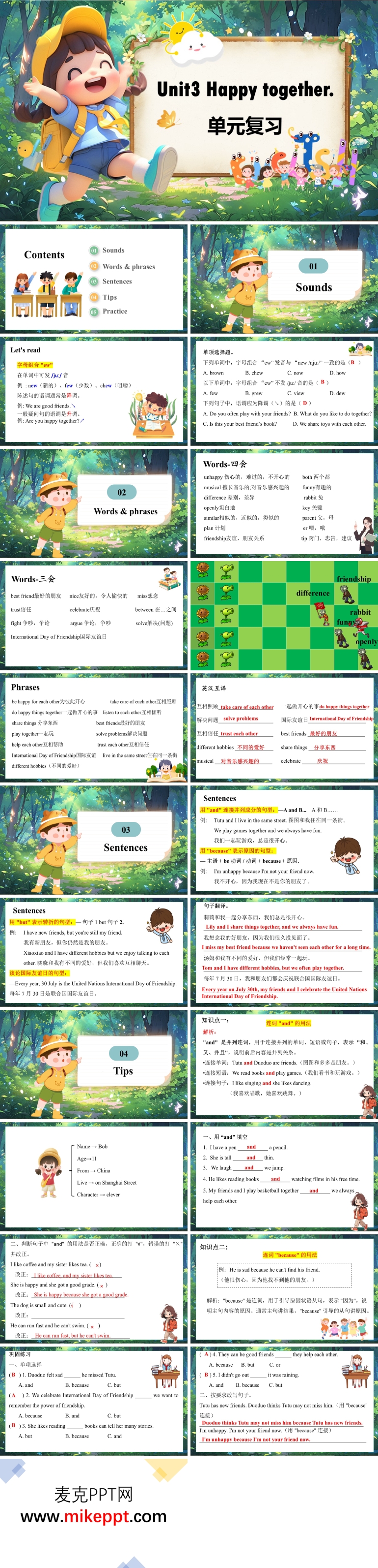 这份总共43页的PPT复习课件,专为五年级英语上册外研版Unit 3《Happy together》量身打造,整堂课以“词汇接龙—情景问答—合作编对话”三维互动为主线,通过“个人抢答+小组共创”的混合机制,把原本零散的单词、短语、句型串成一张可触可感的“知识网”。课件逻辑清晰、节奏明快:先以“音—形”破冰,再以“义—用”升华,最后用“合作—展示”固化,确保每个孩子都能在“会说、能写、敢演”三个层面同时收获成就感。 课堂被切成四个递进板块。第一部分“Word Chain & Phonics”启动“词汇接龙”热身:教师抛出首单词“picnic”,学生按尾字母依次接“cinema—apple—exciting…”并即时拼读,屏幕同步闪现字母组合a-e、i-e的发音规则,用颜色标记强化记忆;接龙中断者需用“happy together”造句,既复习语音又激活句库。第二部分“Lexicon & Sentence Focus”进入“闪卡—默写”双通道:重点短语go on a picnic, fly kites, ride bikes, have a big dinner等以GIF动图形式快闪,学生30秒内在“小黑板”平板默写,系统自动评分并生成“易错榜”,教师针对性讲评,实现“当堂清”。第三部分“Pattern Pool”集中突破句型:What are you going to do? / We’re going to… / How exciting! 采用“情景拼图”法,教师拖拽时间、地点、人物、活动四块拼图,学生即时生成对话并角色扮演,拼完一套即可为小组积1分,积分榜实时滚动,竞争氛围拉满。第四部分“Teacher’s Tips”给出三条“黄金复习法”:1.用“睡前3分钟”录音法自测句型流利度;2.把重点词写成“冰箱贴”,家长随机抽考;3.周末拍30秒“Family Plan”英文Vlog,上传班级云相册,点赞数前五名获“Happy Speaker”电子勋章,勋章满三枚可兑换“免背单”奖励。43张幻灯片在抢答声、欢笑声、掌声中层层推进,让学生不仅“温故”,更“知新”,把复习课变成一场真正“Happy together”的知识嘉年华。