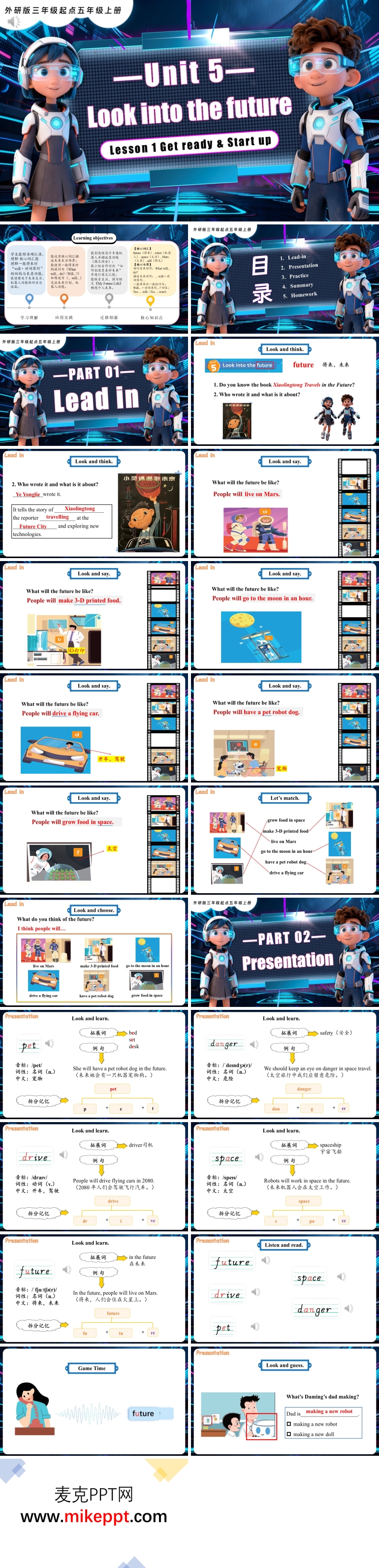 本 PPT 模板专注于 Unit 5 第 1 课时 “Get ready & Start up”,以畅想未来生活和科技探索为主题,引导学生学习与未来相关的基础词汇和句型。通过将知识与趣味相结合,让学生在充满想象力的学习情境中激发浓厚的英语学习热情。课程目标是帮助学生听懂关于未来生活交通工具的简单描述,提取关键信息,并在此过程中提升口语表达能力和想象力,同时强化相关单词和句式的运用。 PPT 内容分为五个部分。第一部分是 Lead-in,这是整个课程的导入环节,至关重要。通过将单词学习代入传统节假日的情景,帮助学生快速进入学习状态,为后续内容的学习奠定基础。这种情景导入不仅能够激发学生的学习兴趣,还能帮助他们更好地理解和记忆词汇,使学习过程更加生动有趣。 第二部分是 Presentation,这一部分的核心是提升学生的记忆能力。通过系统地展示未来生活和科技探索相关的词汇与句型,帮助学生在视觉和听觉的双重刺激下加深记忆。这一环节通过多媒体手段,如图片、视频和动画,将抽象的词汇和句型具体化,使学生更容易理解和掌握。 第三部分是 Practice,实践是检验学习成果的关键环节。通过反复的记忆强化和多样化的练习形式,如角色扮演、小组讨论和口语练习,学生能够将所学知识运用到实际情境中,真正做到实践出真知。这一部分不仅巩固了学生的记忆,还提升了他们的口语表达能力和团队协作能力。 第四部分是 Summary,这是学习过程中的总结与反思环节。在这一部分,学生需要回顾所学内容,总结学习方法和技巧,并记录下来以便日后复习。通过总结,学生可以更好地梳理知识脉络,发现学习中的薄弱环节,并及时加以改进,从而提高学习效率。 第五部分是 Homework,这是对重点单词学习的升华环节。通过布置有针对性的家庭作业,如写作练习、单词拼写和口语表达任务,学生可以在课后继续巩固所学知识,进一步消化和吸收新内容。家庭作业不仅帮助学生巩固课堂所学,还能培养他们的自主学习能力和时间管理能力。 整个 PPT 模板通过这五个部分的有机结合,形成了一个完整的教学体系。从情景导入激发兴趣,到系统呈现知识提升记忆,再到实践练习巩固应用,最后通过总结和作业实现知识的升华,每个环节都紧密相连,相互促进。通过这种系统化的教学设计,学生不仅能够掌握与未来生活相关的词汇和句型,还能在学习过程中提升综合语言运用能力,培养跨文化意识和创新思维,为未来的学习和发展打下坚实的基础。