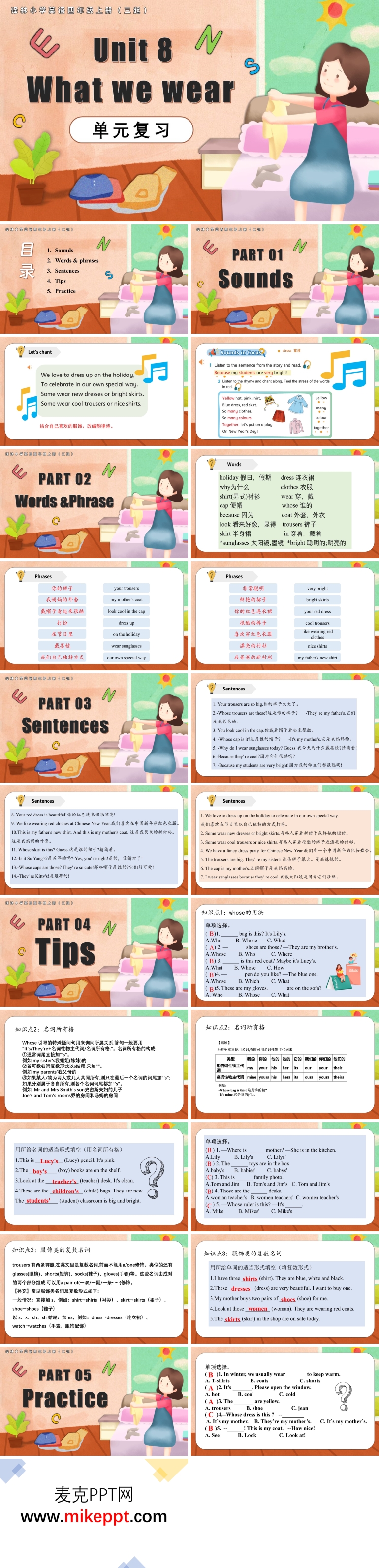 这是一套专为译林小学英语四年级上册(三起)Unit 8 “What we wear” 单元复习设计的 PPT 模板,通过 PowerPoint 制作,共包含 27 张幻灯片。本课件旨在引导学生系统复习本单元所学的服装相关词汇及描述服装的表达方式,通过五个精心设计的部分展开,帮助学生巩固知识并提升语言运用能力。 第一部分是 Lead-in,作为课程的导入环节,通过引导学生阅读一首韵律诗,激发他们的学习兴趣。随后,鼓励学生结合自己喜欢的服饰对韵律诗进行改编,这种互动性强的活动不仅能够让学生在轻松的氛围中回顾服装词汇,还能激发他们的创造力和想象力,为后续学习奠定良好的基础。 第二部分是 Words and Phrases,这一部分专注于复习本单元所学的全部新单词和短语。通过分类整理和反复呈现,帮助学生系统梳理知识,强化记忆。同时,结合图片和例句,使学生能够更直观地理解单词和短语的含义及用法,为后续的语言输出做好准备。 第三部分是 Sentences,这是本课的核心环节之一。通过展示本单元描述服装的重点句型,帮助学生更深刻地掌握相关内容。课件通过情景对话、填空练习等多种形式,引导学生在实际语境中运用这些句型,从而提高他们的语言表达能力和口语交际能力,使学生能够在日常生活中灵活运用所学知识。 第四部分是 Tips,这一部分主要介绍了一些简单的语法知识点,如形容词的使用、名词的单复数形式等。通过简洁明了的讲解和针对性的练习,帮助学生巩固语法知识,解决学习中的难点。这种理论与实践相结合的方式,有助于学生更好地理解和运用语法,提升语言的准确性。 第五部分是 Practice,这是对本单元知识的综合运用环节。通过设计多样化的练习题,如选择题、判断题、连词成句等,引导学生完成本单元相关的练习。这些练习不仅涵盖了词汇、句型和语法,还通过实际情境模拟,帮助学生检验学习成果,进一步巩固所学知识。 整套 PPT 模板通过这五个部分的有机结合,形成了一个完整的复习体系。从导入环节激发兴趣,到词汇和短语的系统复习,再到重点句型的深入讲解和语法知识的巩固,最后通过综合练习检验学习效果,每个环节都紧密相连,层层递进。这种系统化的复习方式不仅帮助学生全面回顾本单元的知识点,还能提升他们的综合语言运用能力,培养自主学习的习惯,为学生今后的英语学习打下坚实的基础。