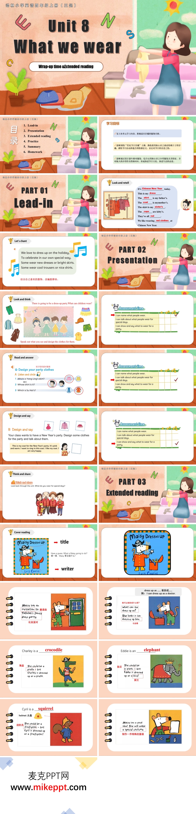 这是一套专为译林小学英语四年级上册(三起)Unit 8 第 3 课时 “Wrap-up time & Extended reading” 设计的 PPT 模板,通过 PowerPoint 制作,包含 35 张幻灯片。本节课的学习目标是引导学生系统巩固单元核心词汇,包括衣物类词汇、评价类词汇和功能性词汇,并熟练运用单元重点句型进行表达。课件通过六个精心设计的部分展开教学,帮助学生在复习中提升语言综合运用能力。 第一部分是 Lead-in,作为课程的导入环节,通过展示图片引导学生回顾并复述本单元所学的故事内容。这种图文结合的方式不仅能够帮助学生快速进入学习状态,还能在回忆故事的过程中巩固核心词汇和句型,为后续学习奠定基础。 第二部分是 Presentation,这一部分通过创设不同的情境,引导学生为人物选择合适的衣服。通过角色扮演和情境模拟,学生能够在实际语境中运用所学的衣物类词汇和评价类词汇,进一步加深对词汇的理解和记忆,同时提升口语表达能力。 第三部分是 Extended reading,通过引入一个与服装相关的绘本故事,拓展学生的阅读视野。学生在阅读过程中不仅能学习故事中的新单词和表达方式,还能通过上下文理解词汇的用法,进一步丰富词汇量。这一部分通过阅读与讨论相结合的方式,帮助学生提升阅读理解能力。 第四部分是 Practice,这一部分通过设计多样化的练习题,如选择题、填空题和匹配题,引导学生完成与本节课相关的练习。这些练习题不仅涵盖了词汇和句型,还通过实际情境模拟,帮助学生巩固所学知识,检验学习效果。 第五部分是 Summary,通过思维导图的方式对本节课所学的核心单词、常用词组以及关键句型进行系统梳理和总结。思维导图的可视化呈现方式能够帮助学生清晰地看到知识之间的联系,便于记忆和复习,同时也培养了学生的逻辑思维能力。 第六部分是 Homework,通过布置有针对性的家庭作业,如书写练习、口语表达任务或制作简单的衣物搭配海报,帮助学生在课后继续巩固所学知识,进一步消化和吸收新内容。家庭作业的设计注重实践性,鼓励学生将所学知识运用到实际生活中。 整套 PPT 模板通过这六个部分的有机结合,形成了一个完整的教学体系。从导入环节的复习回顾,到情境模拟的实践运用,再到阅读拓展、练习巩固、总结梳理以及课后作业的延伸,每个环节都紧密相连,层层递进。这种系统化的教学设计不仅帮助学生巩固了单元核心词汇和句型,还提升了他们的阅读理解能力和语言综合运用能力,为学生今后的英语学习打下坚实的基础。