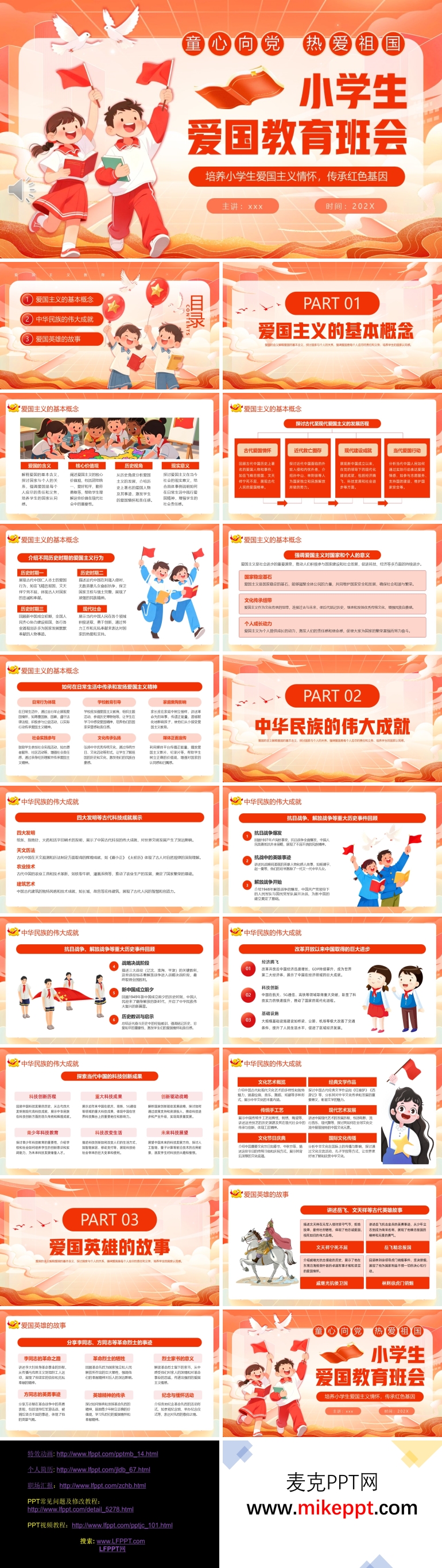 这是一套专为小学生精心设计的爱国主义教育班会PPT课件,由19张内容丰富、图文并茂的幻灯片组成,通过三大板块层层递进,将爱国情怀深深植根于孩子们心中。 第一篇章以"爱国主义的深刻内涵"为主线,从爱国的基本含义与核心价值观切入,带领孩子们穿越时空长廊,追溯爱国主义从古代到现代的发展脉络。课件通过展示不同历史时期仁人志士的报国壮举,让孩子们深刻理解爱国不仅是中华民族的精神基因,更是新时代少年肩负的社会责任,从而激发他们内心深处的家国情怀与使命担当。 第二篇章"中华民族的辉煌成就"则是一场震撼心灵的文明之旅。课件首先展现了造纸术、印刷术、指南针、火药等古代科技瑰宝,让孩子们为祖先的智慧而自豪;继而回顾抗日战争、解放战争等重大历史事件,感受民族独立来之不易;最后聚焦改革开放以来的沧桑巨变,从神舟飞天到蛟龙入海,从高铁飞驰到5G领跑,一幅幅鲜活画面生动诠释着中国力量,增强孩子们的民族自信心与自豪感。 第三篇章"爱国英雄的故事"作为点睛之笔,通过讲述岳飞、文天祥、董存瑞、黄继光等古今英雄的感人事迹,将抽象的爱国精神转化为具体可学的榜样力量,激励孩子们从小学先锋,长大做先锋,将爱国之情转化为报国之行。整套课件思想性与趣味性并重,是开展小学生爱国主义教育的优质载体。