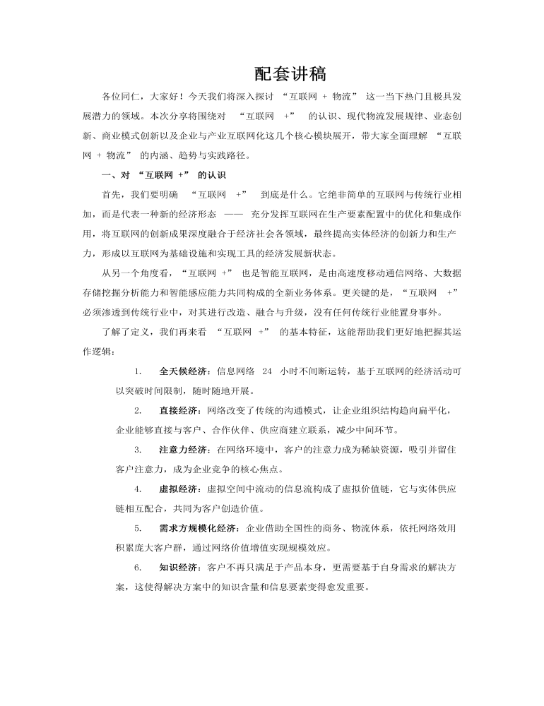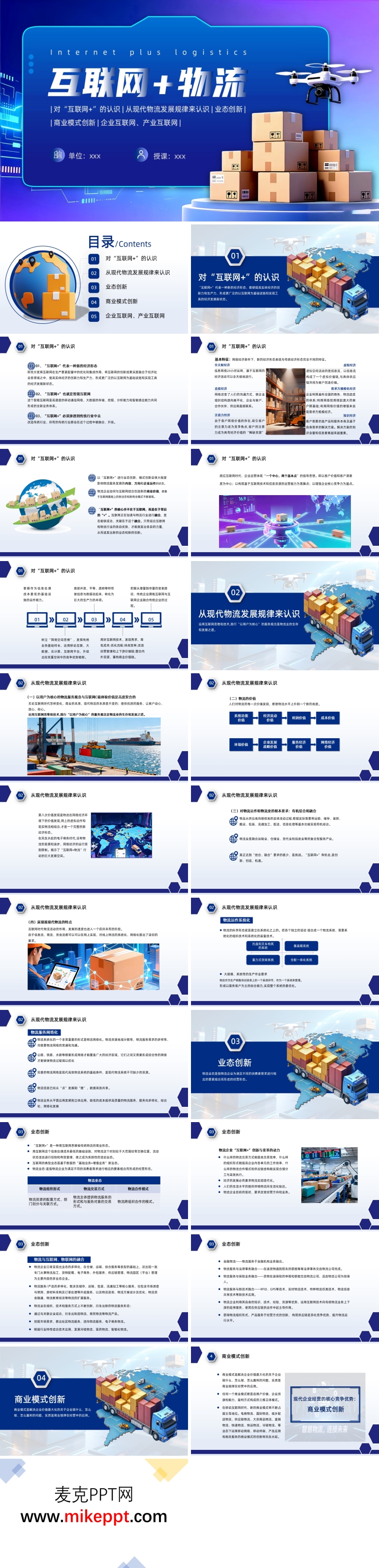 这是一套深度解析"互联网+物流"商业模式的专业PPT课件,由42张内容详实的幻灯片精心构建,从五个维度系统阐述数字化转型浪潮下物流产业的变革路径与商业逻辑。 课件开篇即对"互联网+"进行深度解构,不仅厘清其概念本源,更着重剖析其跨界融合、创新驱动、重塑结构、尊重人性、开放生态等核心特征,为理解物流产业的数字化重构奠定理论基石。 第二部分独具匠心地从现代物流发展规律切入,揭示以用户为核心的服务理念与互联网C端极致体验价值的高度契合性。通过生动形象的方式阐释物流的价值本质,深入探讨物流运作高效化、精准化、可视化的根本要求,并系统梳理现代物流信息化、网络化、智能化、绿色化的鲜明特点,为传统物流向智慧物流转型架起理论与实践之间的桥梁。 第三、四部分聚焦创新主线,分别探讨业态创新与商业模式创新。在业态创新层面,深度分析共享经济、平台经济、众包物流等新业态如何重构物流生态格局;在商业模式创新维度,则系统剖析大数据、云计算、物联网、人工智能等前沿技术如何驱动商业模式从单一运输服务向供应链一体化解决方案转型,从线性价值链向网状生态价值转变。 第五部分升华主题,聚焦企业互联网化与产业互联网化的终极命题,阐释如何运用互联网思维与先进信息技术对传统物流产业进行全流程、全链条、全方位的深度改造,在跨界融合中催生新服务、新产品、新市场,最终实现从企业内部数字化到产业链协同、从单一企业竞争到生态体系竞争的跨越式发展。整套课件理论深度与实践指导并重,是物流企业管理者、从业者及研究者把握行业脉搏、洞悉未来趋势的权威指南。