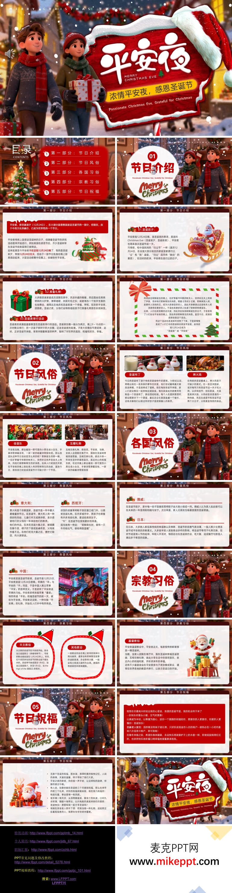 PPT模板内容主要通过PowerPoint软件分几个部分来向我们展开介绍有关于圣诞节平安夜节日介绍PPT课件的相关内容。PPT模板内容第一部分主要向我们详细的介绍了有关于圣诞节和平安夜的节日介绍等等内容。第二部分主要是有关于圣诞节的节日习俗。第三部分主要是有关于各国关于圣诞节的习俗。第四部分是有关于圣诞节的宗教习俗。最后一部分是有关于圣诞节的节日祝福。
