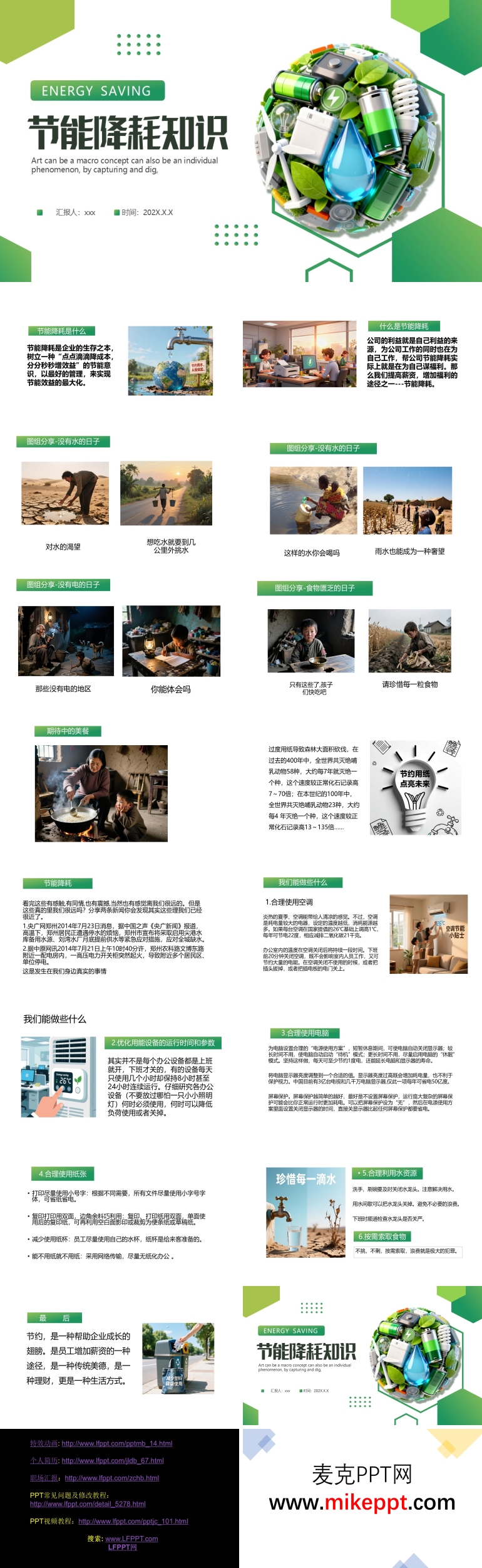 这是一套精心设计的节能降耗主题PPT课件,由17张内容翔实的幻灯片构成。课件以启发式教学为切入点,开篇即抛出两个环环相扣的思考题:"节能降耗是什么?"以及"什么是节能降耗?"这种递进式的提问方式,旨在引导观众从模糊认知走向深度反思,自然而有力地凸显出本节课的学习主旨。 随后,课件巧妙运用视觉冲击力,通过一组极具震撼力的图片,将 abstract 的环保议题具象化为可感知的生存困境——干涸的水龙头、漆黑的房间、空荡荡的餐桌,这些画面无声地叩问着每个人:当基本资源枯竭,我们的生活将何去何从?更发人深省的是,紧接着展示的两则新闻并非来自遥远的他乡,而是切切实实发生在我们身边的故事:也许是小区里因能源浪费引发的设备故障,或许是本地报纸上关于水资源短缺的真实报道。这些近在咫尺的案例瞬间打破了"环保与我无关"的心理壁垒,让观众真切意识到:资源危机不是科幻电影的虚构情节,而是正在悄然逼近的日常现实。 在情感铺垫与认知冲击的基础上,课件将重心转向更具建设性的议题——我们能做些什么?这一部分系统梳理了六大实践维度:其一,科学调控空调使用,既减少能源消耗,又降低二氧化碳排放;其二,精细化管理用能设备的运行时段与技术参数;其三,培养电脑使用的节能习惯;其四,推行纸张循环利用,如采用小号字体打印、坚持双面复印、减少一次性纸杯消耗等;其五,珍惜水资源,做到洗手、刷碗后随手关闭水龙头,杜绝点滴浪费;其六,树立"按需取食"的理念,从源头避免食物浪费。这六个方面层层递进,既涵盖办公场景,又延伸生活细节,为观众提供了一套可操作、可落地的行动指南,将环保意识转化为具体实践,让节能降耗真正成为人人可为、时时可为的生活方式。