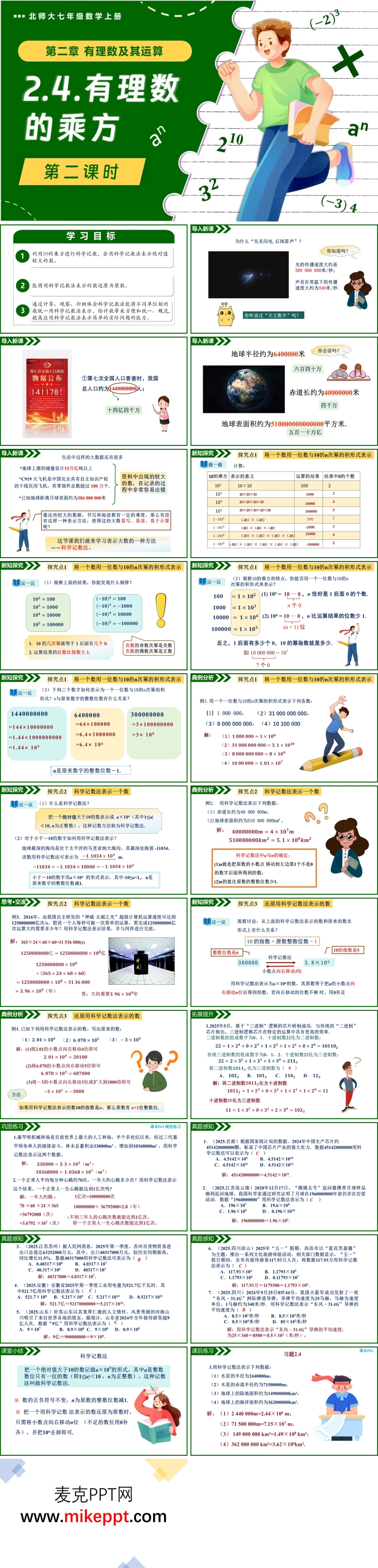 这是一套关于北师大版七年级数学上册“2.4 有理数的乘方第 2 课时”的 PPT,共 28 页。通过本节课的学习,学生能够熟练掌握有理数混合运算的顺序,并深刻感受乘方运算在数学中的重要作用。在课堂上,教师精心设计了课堂任务清单表格,引导学生通过小组合作的方式完成表格内容,使学生在合作探究中明确有理数混合运算的顺序,提升他们的自主学习能力和团队协作能力。此外,教师还精心挑选了乘方的应用拓展题,包括数字规律探究和实际最值问题等类型。这些拓展题旨在发散学生的探究思维,激发他们对数学知识的深入思考,同时培养学生严谨的解题习惯,让学生在解决实际问题的过程中体会数学的应用价值。 这份 PPT 的内容结构清晰,共分为五个部分。第一部分是导入新课环节。此环节以“天文数字”作为课堂引入,激发学生的好奇心和求知欲。接着,通过介绍人口普查的数据,让学生感受到数据的庞大,进而引出生活中的大数据,为后续学习乘方运算做好铺垫,使学生初步认识到乘方运算在处理大数时的便捷性。 第二部分是新知探究环节。这一部分是本节课的核心内容,主要包括 10 的乘方的意义、有理数混合运算的顺序以及科学计数法的运用方法。通过详细讲解和实例演示,帮助学生理解 10 的乘方的规律和特点,掌握有理数混合运算的先后顺序,以及如何运用科学计数法表示较大的数或较小的数,为学生解决实际问题提供有力的工具。 第三部分是拓展提升和巩固练习环节。这一部分一方面呈现了精心设计的随堂练习题,这些练习题旨在巩固学生对新知识的理解和掌握,帮助学生及时发现和纠正学习过程中存在的问题。另一方面,展示了近年来的数学真题,让学生在练习中感受中考命题的方向和趋势,提高学生解题的准确性和速度,增强学生应对考试的信心。 第四部分是课堂小结和课后练习环节。在课堂小结部分,教师引导学生回顾本节课所学的主要内容,包括有理数混合运算的顺序、乘方的意义以及科学计数法的运用等,帮助学生梳理知识体系,加深对知识的理解和记忆。同时,布置有针对性的课后练习,让学生在课后进一步巩固所学知识,拓展思维,提高数学综合素养。 第五部分是作业布置环节。教师根据学生的实际情况,布置适量且具有层次性的作业,既包括基础性作业,帮助学生巩固基础知识,又包括拓展性作业,满足不同层次学生的学习需求,鼓励学生自主探究,培养学生的创新思维和实践能力。 总之,这套 PPT 内容丰富,设计合理,能够有效引导学生学习有理数的乘方知识,提升学生的数学思维能力和解题能力,是一份实用的教学资源。