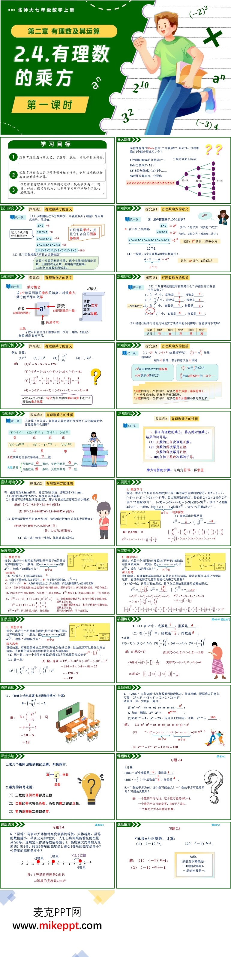 这是一套专为北师大版七年级数学上册“2.4 有理数的乘方第 1 课时”设计的演示文稿,共包含 23 张幻灯片。在本节课中,教师通过精心设计的教学环节,帮助学生逐步深入理解有理数乘方的概念及其运算规律。 课程伊始,教师通过展示生动的课堂情景,引导学生初步接触有理数乘方的概念,激发学生的学习兴趣。随后,教师巧妙地通过问题导入,引出本节课的核心知识,为后续学习奠定基础。接着,教师呈现了多种类型的乘方算式,鼓励学生以小组合作的方式展开探究,共同总结有理数乘方的符号规律。这种合作学习的方式不仅培养了学生的团队协作能力,还加深了他们对知识的理解。在学生自主探究的基础上,教师通过例题的详细示范,帮助学生掌握乘方运算的具体步骤,确保学生能够准确、规范地进行乘方运算。 为了巩固学生的学习成果,教师精心设计了多种类型的习题,包括基础的乘方运算和贴近生活的情境应用题。这些习题不仅涵盖了本节课的重点知识,还通过生活化的场景引导学生将数学知识与实际问题相结合,培养学生全面思考和解决实际问题的能力。 从整体结构来看,这份演示文稿分为四个部分。第一部分是学习目标,教师清晰地呈现了本节课的三大学习目标,让学生在上课之初就明确学习方向,增强学习的针对性。第二部分是新知探究环节,这一部分首先介绍了有理数乘方的意义,帮助学生从本质上理解乘方运算;接着深入探讨有理数乘方的性质,引导学生发现其中的规律;最后对乘方运算的步骤进行简要说明,为学生后续的自主练习提供指导。第三部分是拓展提升和巩固练习,涵盖概念学习、简便运算和真题感知三个板块。通过这些内容,学生不仅能够巩固新学的知识,还能通过真题感知提升解题能力,拓宽思维视野。第四部分是课堂小结和课后练习,教师引导学生回顾本节课的重点内容,梳理知识体系,同时布置适量的课后练习,帮助学生进一步巩固所学知识,提升数学素养。 总之,这套演示文稿内容丰富、结构合理、设计巧妙,通过多种教学方法和丰富的练习形式,有效引导学生学习有理数乘方的相关知识,培养学生的数学思维能力和解决问题的能力,是一份实用且高效的教学资源。