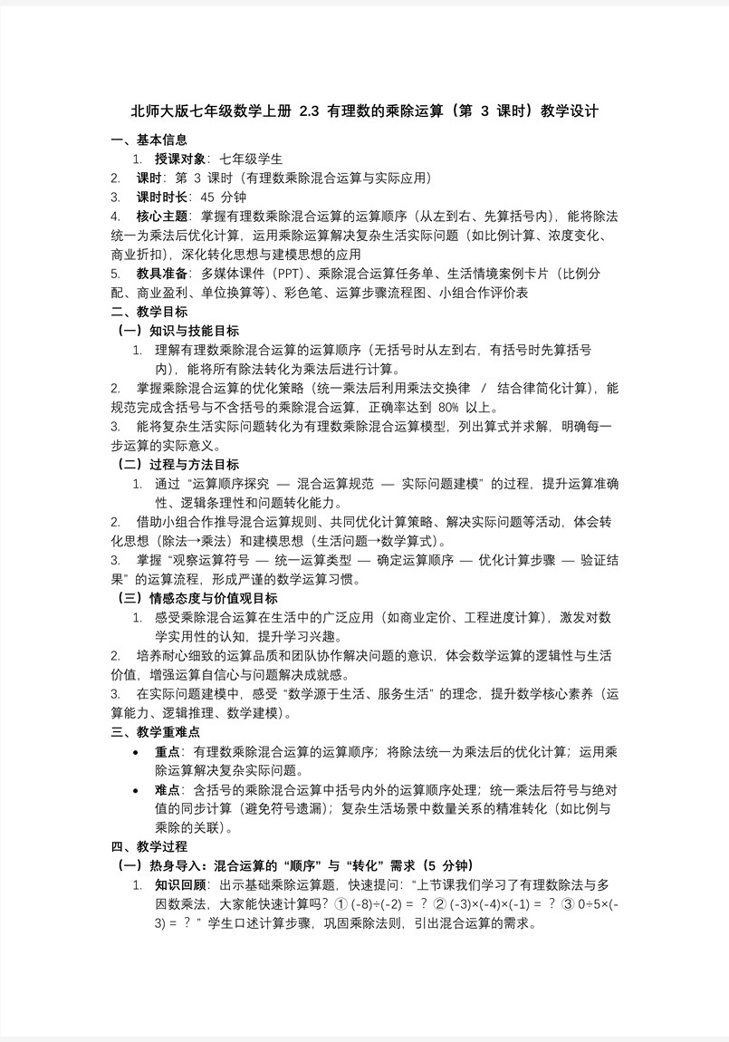 这是一套专为北师大版七年级数学上册“2.3 有理数的乘除运算第 3 课时”设计的 PPT,共包含 33 页。通过本节课的学习,学生将能够熟练掌握有理数乘除混合运算的运算顺序,并学会运用乘除运算解决实际数学问题,从而显著提升他们的数学应用能力。在课堂学习过程中,学生不仅能够感受到乘除混合运算在日常生活和数学学习中的广泛应用,还能通过小组合作等方式培养团队协作能力。同时,通过一系列的练习和实践,学生将深刻体会到数学运算的价值,进而增强数学运算的自信心,为后续的数学学习奠定坚实基础。 这份 PPT 的内容结构清晰,共分为五个部分。第一部分是学习目标。此部分首先介绍了有理数除法法则,明确了学生需要掌握的核心知识;其次,对有理数除法运算顺序进行了详细说明,帮助学生理解运算过程中的先后顺序;最后,强调了对学生能力和思维的培养,使学生在掌握知识的同时,提升思维能力和解决问题的能力。 第二部分是知识回顾与导入新课。这一部分通过复习乘法运算和除法运算之间的关系,帮助学生巩固已学知识,为新知识的学习做好铺垫。同时,重点介绍了倒数的作用,引导学生理解倒数在有理数除法运算中的重要性,为后续探究有理数除法法则奠定基础。 第三部分是新知探究。这一部分是本节课的核心内容,分为三个探究环节。首先,探究了有理数除法的第一个法则,通过具体的例子和详细的讲解,帮助学生理解除法运算的基本规律。接着,对第二个法则进行探究,进一步深化学生对有理数除法的理解。最后,通过综合实例,探究有理数的混合运算,引导学生掌握乘除混合运算的顺序和方法,培养学生的综合运算能力。 第四部分是新知总结与巩固练习。在这一部分,教师对本节课所学的有理数除法法则和混合运算顺序进行总结,帮助学生梳理知识体系,加深对知识的理解和记忆。同时,设计了多样化的巩固练习题,包括基础练习和拓展应用题,让学生在练习中巩固所学知识,提升解题能力,进一步强化对有理数乘除混合运算的理解和应用。 第五部分是课后练习与作业。为了进一步巩固学生的学习成果,教师精心设计了课后练习和作业。这些练习和作业既包括基础性题目,帮助学生巩固课堂所学知识,又包括拓展性题目,满足不同层次学生的学习需求,鼓励学生自主探究,培养学生的创新思维和实践能力。 总之,这套 PPT 内容丰富、结构合理、设计科学,通过明确的学习目标、系统的知识回顾、深入的新知探究、扎实的巩固练习以及有针对性的课后作业,全面覆盖了本节课的教学重点和难点。它不仅能够帮助学生系统地学习有理数乘除混合运算的知识,还能通过多样化的教学方法和丰富的练习形式,激发学生的学习兴趣,培养学生的数学思维能力和团队协作能力,是一份极具实用性和教学价值的优质教学资源。