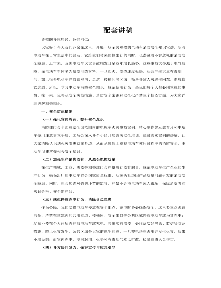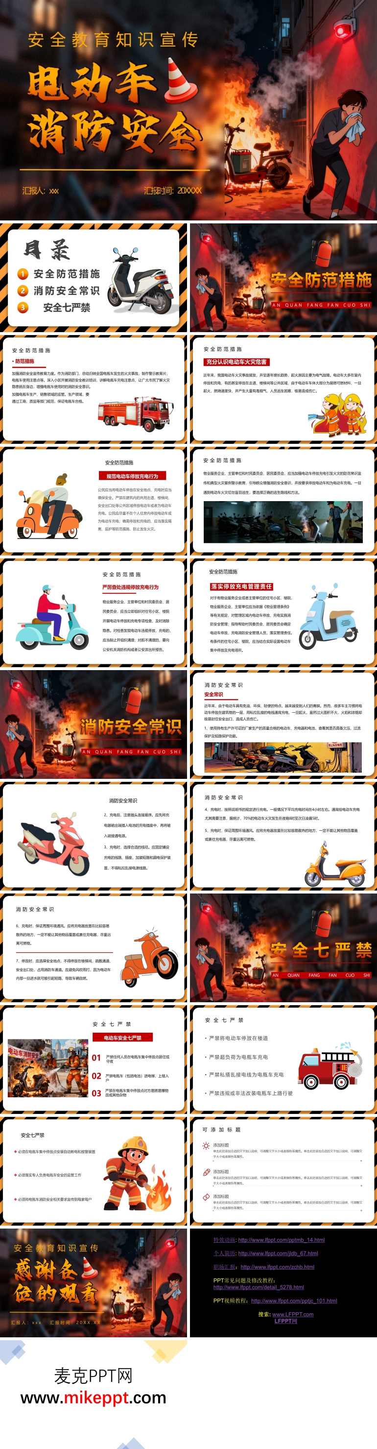 这是一套系统化、针对性强的电动车消防安全教育PPT课件,由20张结构严谨的幻灯片组成,从"防范—常识—禁令"三个层面构建起完整的安全知识体系。第一部分聚焦"安全防范措施",开篇即强调必须加大消防安全宣传教育力度,通过真实火灾案例的震撼展示与数据分析,让受众直观认识电动车火灾的突发性强、蔓延速度快、烟雾毒性大等致命危害,从而在思想上筑牢安全防线。在此基础上,课件详细阐释规范电动车停放充电行为的具体标准,明确指出应严厉查处入楼入户、飞线充电等违规行为,并层层压实停放充电管理责任,构建从社区物业到业主个人的责任传导链条,形成闭环管理。 第二部分"消防安全常识"则深入技术细节,围绕电动车充电这一高风险环节,系统讲解充电时长控制、充电器匹配、环境温度要求、电路负荷评估等关键知识点,通过图文并茂的方式,帮助人们掌握科学充电方法,识别并规避常见操作误区,提升日常安全防范能力。 第三部分"安全七严禁"以刚性约束的方式划出不可逾越的生命红线:严禁任何人员在电瓶车集中停放点居住或守夜;严禁电瓶车(含电池)进电梯、上楼入户;严禁将电动车停放在疏散楼道、安全出口等生命通道;严禁超负荷、超时长为电瓶车充电;严禁私搭乱接电线充电;严禁私自改装车辆及电池;严禁使用非标充电器。每一条禁令都配以违法后果与事故警示,强化法治威慑。整套课件内容详实、逻辑清晰,兼具教育性与警示性,是筑牢社区、单位电动车消防安全防线的重要工具。