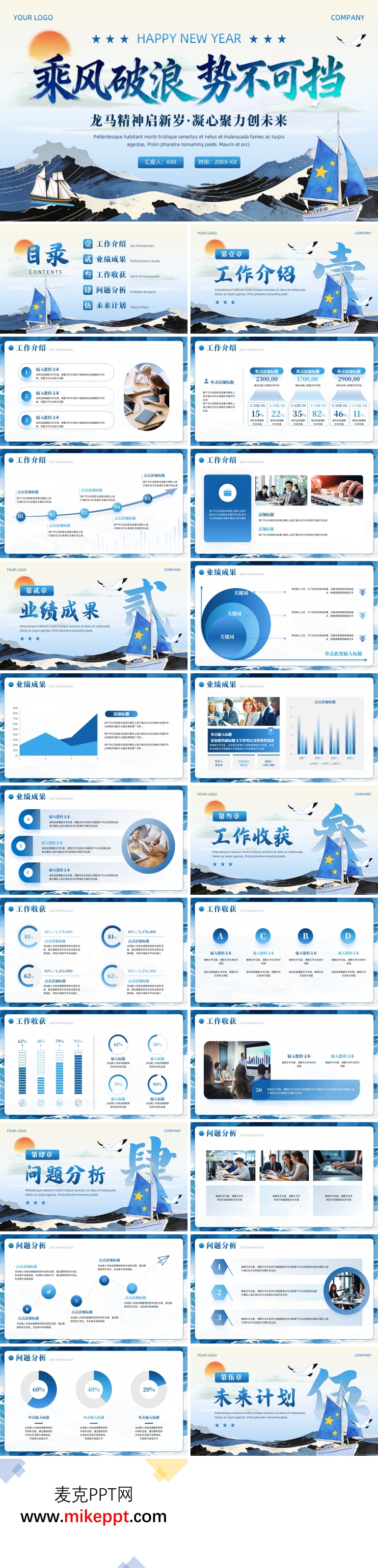 这是一套专为2025年终总结与新年计划量身打造的系统性PPT课件,由28张逻辑严密、内容饱满的幻灯片构成,将复盘反思与战略前瞻有机融合,搭建起连接过往成就与未来蓝图的坚实桥梁。课件开篇即阐明核心理念:年终总结绝非简单的流水账,而是对全年工作的深度复盘与经验沉淀,通过系统梳理得失成败,提炼可复用的方法论;新年计划则是基于复盘成果的行动纲领,通过锚定关键目标、规划实施路径,实现个人能力与工作效能的跃迁式成长。 课件主体内容层层递进,从五个维度展开精细化设计。第一部分"工作介绍"突破平铺直叙的局限,要求汇报者精准提炼核心职责,将日常琐碎事务升华为价值创造的主线叙事,为后续内容奠定清晰的语境基础。第二部分"业绩成果"倡导数据可视化表达,通过表格、图表等量化工具,客观呈现年度关键绩效指标,让成绩可衡量、可对比,凸显贡献度与价值感。第三部分"工作收获"倡导全景式回顾,不仅局限于专业技能的提升,更涵盖思维模式的迭代、协作能力的增强、抗压心态的成熟等多元成长维度,实现从"做事"到"成人"的升华。 第四部分"问题分析"是整份课件的点睛之笔,要求直面挑战、不回避短板,通过系统罗列工作堵点与瓶颈,运用根因分析法进行深度归因,将每一次失利转化为认知升级的契机,培养批判性思维与持续改进意识。第五部分"未来计划"则强调从战略构想到战术落地的闭环设计,通过科学设定SMART目标,将宏大愿景拆解为可执行、可追踪的具体任务,确保新年工作开好局、起好步。整套课件既有宏观视野,又具实操细节,是个人述职与团队赋能的优质工具。