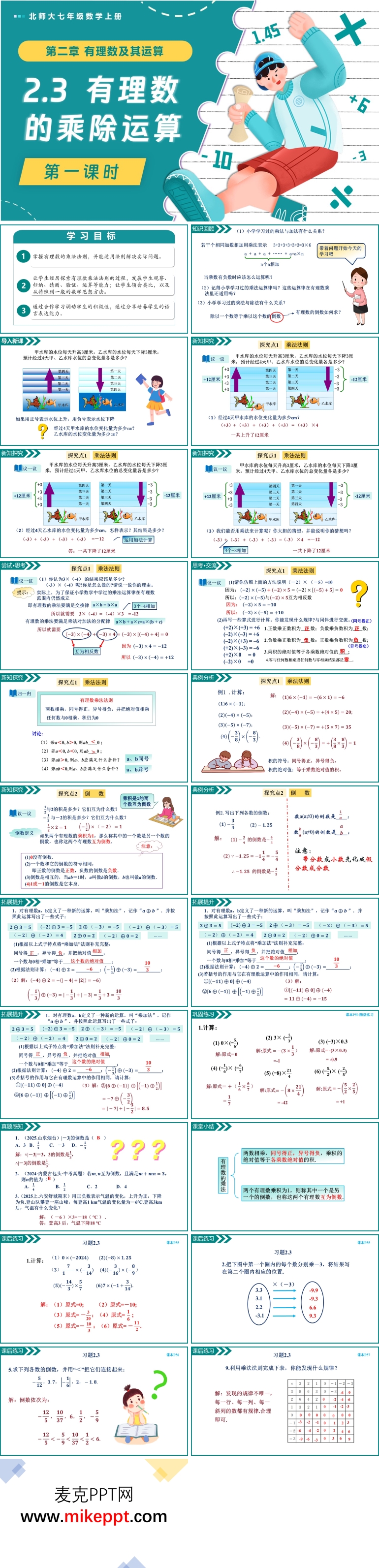 这是一套关于北师大版七年级数学上册“2.3 有理数的乘除运算”第1课时的PPT,共23页。通过本节课的学习,学生将深入理解有理数乘法的意义,掌握其乘法法则,并能够熟练运用法则进行计算。同时,教师将组织学生开展小组讨论,引导他们自主归纳有理数乘法法则,通过例题示范帮助学生掌握运算步骤。此外,通过一系列习题的练习,学生的运算能力与解决问题的能力将得到显著提升,同时也能深刻体会到有理数乘法在实际问题中的应用价值。 这份PPT分为五个部分。第一部分是学习目标,明确了本节课的重点内容,包括有理数乘法法则的介绍、运算顺序的讲解,以及对学生能力与数学思维的培养。第二部分是知识回顾与导入新课,通过课前数学问题和课堂情景的设置,帮助学生回顾旧知识,自然过渡到新知识的学习。第三部分是新知探究环节,详细介绍了有理数乘法法则的计算方法,并对导数的定义及其应用进行了阐述,帮助学生从理论到实践逐步深入理解。第四部分是拓展提升与巩固练习,通过多样化的练习题,帮助学生进一步巩固所学知识,提升综合运用能力。第五部分是课堂小结与课后练习,对本节课的重点内容进行总结回顾,并布置课后练习,以巩固学习成果。 这套PPT结构清晰,内容丰富,既注重知识的传授,又重视学生能力的培养,是一份非常实用的教学资源。
