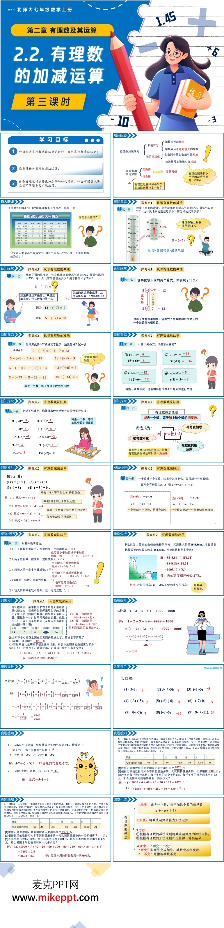 这是一套专为北师大版七年级数学上册“2.2 有理数的加减运算”第3课时设计的演示文稿,共包含27张幻灯片。在本节课的教学过程中,教师通过精心设计的教学环节,帮助学生系统掌握有理数加减运算的相关知识,并提升他们的数学运算能力。 课程伊始,教师通过引导学生回顾旧知识,帮助他们巩固已学内容,打牢基础。同时,教师设计了生动的课堂情境并呈现相关问题,这不仅能够激发学生的学习兴趣,还能自然地导入新课内容,使学生快速进入学习状态。在新知识的学习过程中,教师采用了小组合作的教学方法,通过小组讨论和合作探究,学生不仅能够掌握去括号法则的推导过程,还能学会含括号的混合运算步骤。这种合作学习模式不仅培养了学生的团队协作能力,还增强了他们自主学习和解决问题的能力。 为了进一步巩固所学知识,教师在课堂上呈现了一系列闯关习题,包括口算、计算和真题感知等环节。这些习题设计层次分明,从基础到拓展逐步提升难度,帮助学生在不同层次的练习中运用所学知识解决实际问题,从而有效提升他们的运算能力和知识应用能力。 这份演示文稿由四个部分组成。第一部分是知识回顾环节,主要复习有理数加法法则和加法运算律,帮助学生温故知新,为新知识的学习做好铺垫。第二部分是导入新课和新知探究环节,首先通过课前问题引入新知识,接着详细讲解有理数减法的法则,并通过实例展示其应用,帮助学生理解减法运算的规律和方法。第三部分是拓展提升和巩固练习,通过“口算”“计算”和“真题感知”三个环节,帮助学生在不同形式的练习中巩固所学知识,提升解题能力。第四部分是课堂小结和课后作业,总结本节课的重点内容,布置课后作业,帮助学生进一步巩固学习成果。 通过这套演示文稿,学生能够在教师的引导下,系统地学习有理数加减运算的相关知识,掌握去括号法则和含括号混合运算的步骤,并通过多样化的练习提升运算能力和解决问题的能力。这种教学设计不仅注重知识的传授,更重视学生能力的培养,能够有效提升学生的学习兴趣和数学素养,为后续学习打下坚实基础。