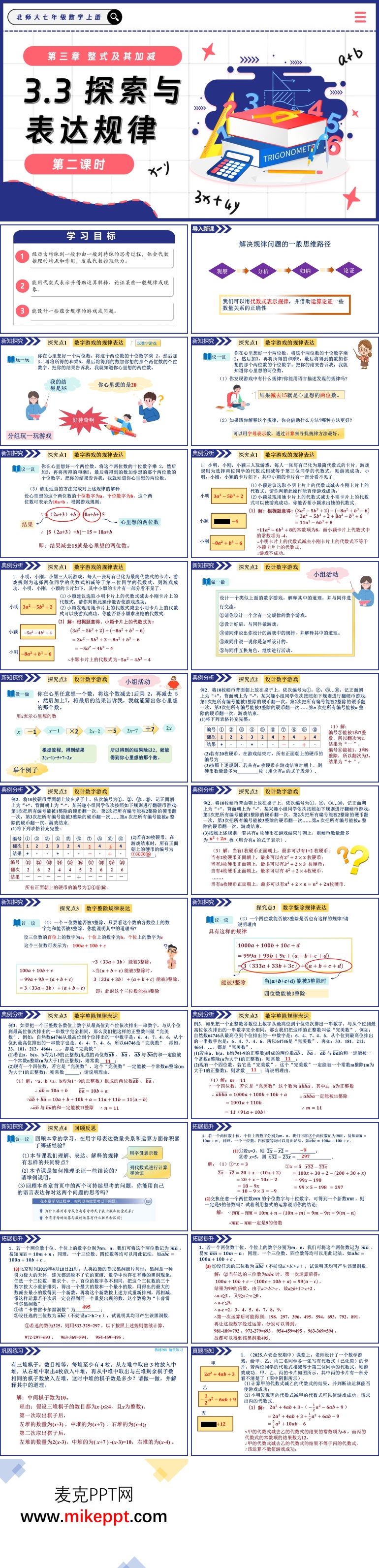本套 PPT 课件是针对北师大数学七年级上册 3.3 探索与表达规律(第 2 课时)精心设计的,共包含 29 张幻灯片。本节课的核心目标是引导学生在复杂图形组合、实际生活场景以及跨学科情境中,深入探索复杂规律的发现与表达方法。通过学习,学生能够将复杂规律转化为多层代数式表达,深刻体会“分部分探索—整体整合”的数学思想,从而全面提升规律探索的综合应用能力。同时,课程还注重让学生感受复杂规律在生活与艺术中的广泛应用,体会探索复杂规律过程中的挑战性与成就感,激发学生对数学规律深入探究的兴趣。 PPT 的内容安排逻辑清晰、层次分明。首先,通过回顾解决规律问题的一般思维路径,自然地引出本节课的学习主题,为后续学习奠定基础。接着,课程进入数字游戏环节,引导学生在趣味游戏中探索规律,并尝试自己设计数字游戏,掌握数字整除规律的表达方法,这一过程不仅增强了学生对规律的感性认识,还培养了他们的创新思维和自主探究能力。 随后,PPT 进入典例分析阶段,通过精心挑选的典型例题,详细讲解解题步骤,帮助学生逐步掌握解决实际问题的方法和技巧,进一步提升学生运用规律解决复杂问题的能力。为了巩固学生对知识点的理解和应用,PPT 还设计了巩固练习环节,通过多样化的练习题,让学生在实践中加深对规律的认识和掌握。此外,真题感知环节则让学生提前接触中考真题,感受中考题型和难度,帮助学生更好地适应考试要求,增强应试能力。 整体而言,本套 PPT 课件内容丰富、形式多样,既注重知识的传授,又关注学生思维能力的培养和学习兴趣的激发,是一套实用性强、教学效果显著的教学资源。