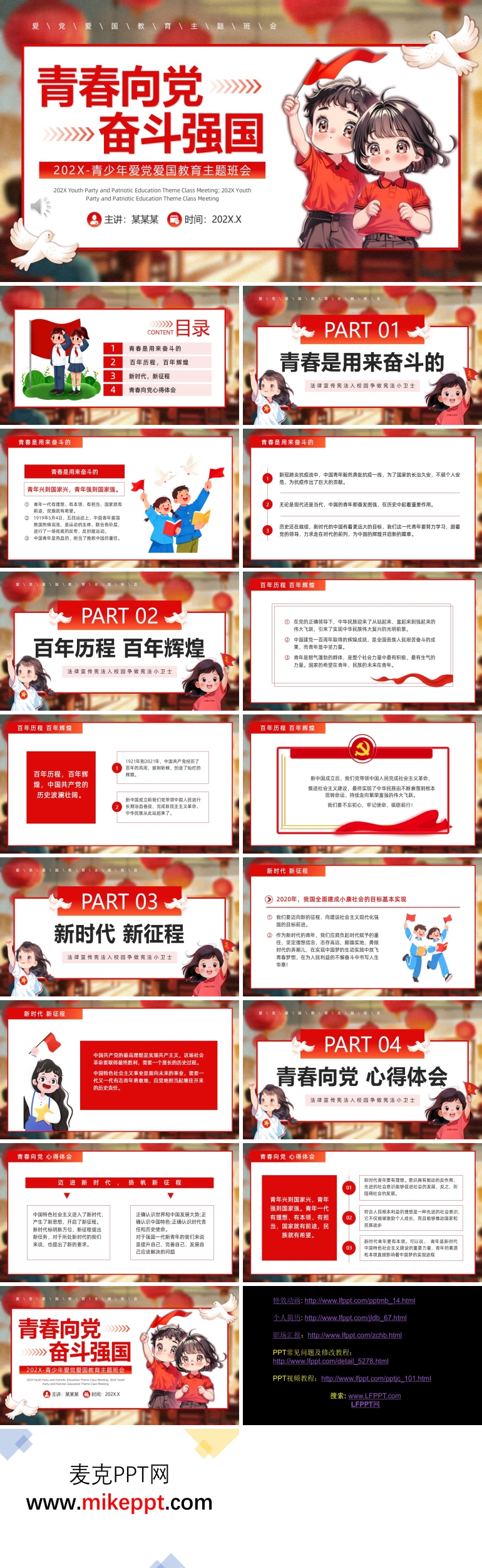 PPT模板内容主要通过PowerPoint软件分几个部分来向我们展开介绍有关于青少年爱国教育主题班会课件内容。PPT模板内容第一部分主要向我们详细的介绍了有关于“青春是用来奋斗的”相关内容。第二部分主要是有关于“百年历程,百年辉煌”的相关内容。第三部分主要是有关于“新时代,新征程”的相关内容。最后一部分主要是有关于青春向党心得体会的相关内容。