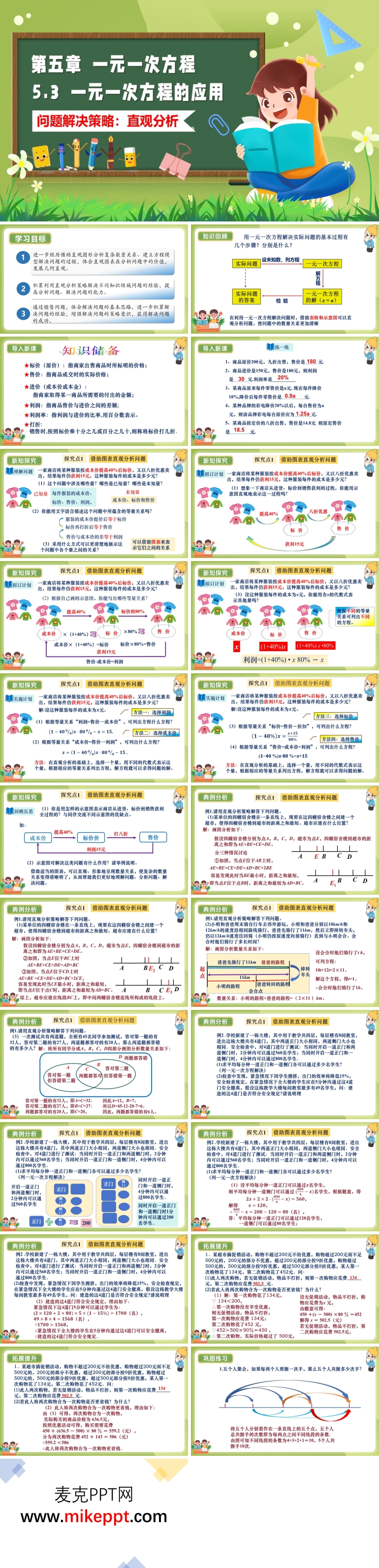 这份三十七张幻灯片组成的PPT课件,聚焦北师大版七年级数学上册第五单元“5.3 一元一次方程的应用”之“问题解决策略:直观分析”,以“把抽象关系画出来、把隐藏条件看出来、把方程列出来”为总目标,带领学生用线段图、表格、色块图等视觉工具,给看似杂乱的生活问题装上“导航仪”。课堂循着“回顾—建模—画图—转化—反思”五环推进:教师先用一张“误点动车”动态条形图复习“设、列、解、验、答”五部曲,学生边看边口述未知量,唤醒旧知仅需两分钟;紧接着抛出“接力赛”情境——甲队先跑若干秒、乙队后追,速度不同、终点相同,教师不提供任何数字,只给空白线段图,学生四人一组用磁性箭头在黑板贴出“起点差距”“速度差距”“同时到达”三大关键段,台下同学用点赞贴纸评选“最一目了然示意图”,在比拼与修正中自发悟出“路程差=速度差×时间”的等量核心,随后才引入具体数值,顺理成章设元、列方程、求解、回代,完成“图→式→解→答”的完整闭环。 为了证明“直观策略”的普适性,课件随即切换到“超市购物”场景:同款饮料大杯小杯单价不同,会员再享折扣,总价如何最少?学生先用双色表格列出“容量—原价—折扣价—单价/毫升”四栏,一眼看出“单位价格”高低,再用色块图比较“买大杯省多少钱”,当数字关系被颜色与长度直观呈现后,设未知数、列方程变得水到渠成。教师趁势总结“先画图、再找量、后找等”的直观三字经,并提醒“图要简洁、量要标注、等要突出”。 巩固环节设置“三级闯关”:基础层给线段图补缺失数据;提高层根据文字叙述独立画出表格并列出方程;拓展层选用中考真题,要求用两种图示并列解答,系统自动生成“直观度—正确率”雷达图,教师依据数据当场进行“图式门诊”。课末,学生共写“直观分析心法”:一读题、二画图、三标量、四找等、五列式、六检验,截屏生成二维码保存。整套课件通过“视觉冲击—动手构图—策略对比—即时反馈”的闭环设计,不仅让学生熟练掌握“把文字变图表、把图表变等式”的核心技能,更在一次次“画着画着,思路就亮了”的成功体验中,真切感受数学的简洁与力量,学习兴趣、自信心与应用意识同步拔节。