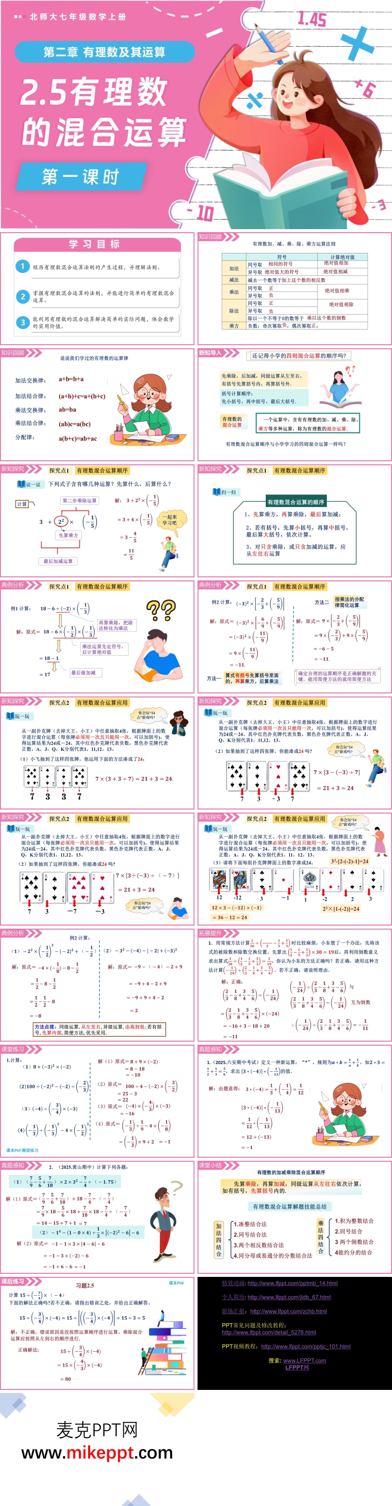 本套演示文稿是为北师大版七年级数学上册 2.5 有理数的混合运算(第 1 课时)设计的教学资源,共包含 20 张幻灯片。通过本节课的教学,教师旨在帮助学生系统掌握有理数混合运算的基本规则,规范解题步骤,并通过多样化的教学活动提升学生的运算能力。 在教学过程中,教师首先通过出示运算题唤醒学生对旧知识的记忆,同时结合课堂情景引导学生列出混合运算表达式,帮助学生回顾已学知识。这一环节不仅巩固了学生对有理数运算律的理解,还为新知识的学习做好了铺垫。 随后,教师运用多种教学活动,如小组合作、讨论分析和知识归纳等,引导学生逐步掌握有理数混合运算的顺序。通过这些互动性强的活动,学生能够在合作中交流思想,在讨论中深化理解,并通过知识归纳总结出混合运算的规范步骤。这一过程不仅提升了学生的数学思维能力,还增强了他们的团队协作能力。 在巩固练习环节,学生通过一系列精心设计的练习题,进一步提升运算能力。这些练习题涵盖了不同难度层次,从基础运算到稍复杂的混合运算,逐步引导学生熟练运用所学知识解决问题,从而加深对混合运算规则的理解。 演示文稿由四个部分组成。第一部分是知识回顾与新知导入。在这一部分,教师首先复习有理数的运算律,帮助学生巩固加法、减法、乘法和除法的基本规则。随后,引入四则混合运算的顺序,为新知识的学习奠定基础。 第二部分是新知探究环节。这一部分首先详细介绍有理数混合运算的顺序,即先算乘方,再算乘除,最后算加减,同级运算从左到右依次进行。接着,通过具体实例讲解有理数混合运算的应用,帮助学生理解如何将混合运算应用于实际问题。最后,对运算方法进行简要说明,帮助学生总结解题技巧。 第三部分是拓展提升与课堂练习。这一部分通过拓展性问题和更具挑战性的练习,进一步提升学生的运算能力和思维深度。同时,课堂练习环节设计了多样化的题目,帮助学生巩固所学知识,增强运算的准确性和效率。 第四部分是课堂小结与课后练习。课堂小结部分对本节课的重点内容进行回顾,总结有理数的加减乘除混合运算顺序,帮助学生梳理知识脉络。课后练习部分则设计了针对性的作业,帮助学生在课后进一步巩固所学内容,提升运算能力。 整体而言,本套演示文稿内容丰富、结构合理,通过知识回顾、新知探究、拓展练习和课堂小结等环节,系统地引导学生掌握有理数混合运算的规则。同时,通过多样化的教学活动和练习设计,充分调动学生的学习积极性,提升他们的运算能力和数学素养,是一套极具实用性和教学价值的教学资源。