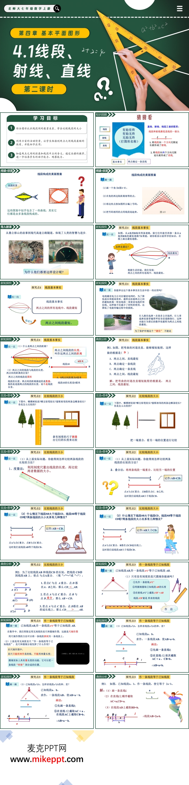 本套 PPT 课件是围绕北师大数学七年级上册 4.1“线段、射线、直线”第 2 课时精心制作的,共包含 40 张幻灯片。本节课的教学目标是通过动手操作,引导学生探究直线的基本事实,使学生深入理解并掌握线段的性质以及两点间距离的定义。在此基础上,培养学生运用这些性质解决生活中实际问题的能力,进一步强化学生的几何直观与应用意识,为后续学习几何作图与计算打下坚实基础。同时,通过本节课的学习,让学生充分感受直线性质与线段性质在生活中的广泛应用,深刻体会数学的实用性与工具性。 该套 PPT 的内容安排条理清晰、层次分明。首先,带领学生回顾直线、射线、线段三者之间的联系,帮助学生梳理知识脉络,为后续学习奠定基础。接着,通过引导学生共同探讨,深入探究线段的基本事实,使学生掌握比较线段大小的方法以及如何做一条线段等于已知线段的方法,让学生在探究过程中逐步加深对知识的理解。然后,通过典例分析,针对具体问题进行详细剖析,引导学生学会具体问题具体分析,从而有效提高学生解决实际问题的能力。 此外,该套 PPT 还精心设计了巩固练习和真题感知两个环节。通过多样化的练习方式,让学生在练习中巩固所学知识,加强对知识点的理解和应用,进一步提升学生的解题能力,使学生能够更好地将所学知识运用到实际问题中,实现知识的灵活运用。