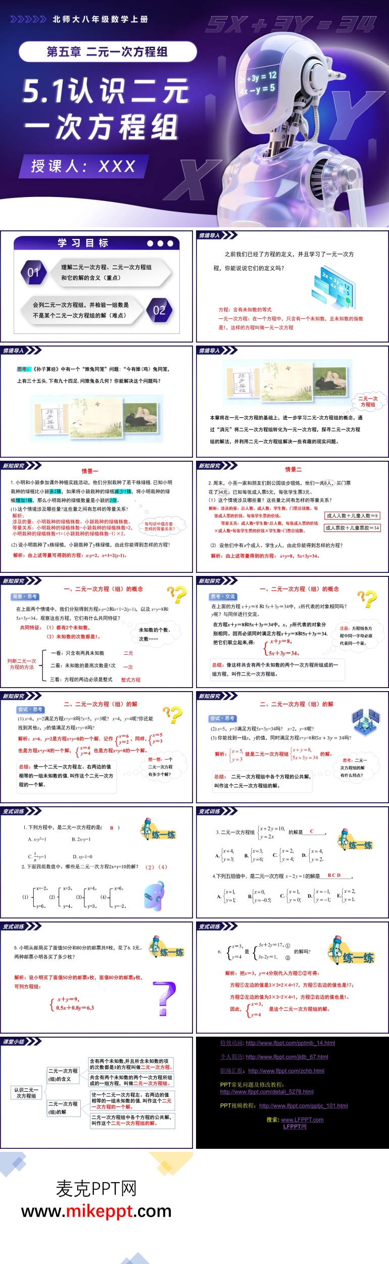 本套 PPT 课件是为北师大数学八年级上册 5.1“认识二元一次方程组”精心设计的,共包含 16 张幻灯片。本节课的核心目标是引导学生深入理解二元一次方程和二元一次方程组的定义,掌握从实际问题中提炼两个等量关系并列出二元一次方程组的方法,初步体会数学建模思想。通过本节课的学习,学生将深刻感受到二元一次方程组在解决实际问题中的独特优势,从而激发他们的学习兴趣和探究欲望。 在内容设计上,PPT 首先通过回顾一元一次方程的定义,帮助学生巩固已有知识,同时为引入二元一次方程组的概念做好铺垫。这种由旧知引出新知的方式,能够帮助学生更好地理解和接受新知识,降低学习难度。接着,通过具体的生活情境和实际问题,引导学生逐步理解二元一次方程(组)的概念。例如,通过解决实际问题中的数量关系,让学生明确二元一次方程组的结构和特点,帮助他们建立起从实际问题到数学模型的桥梁。 在教学过程中,PPT 结合具体实例,详细讲解了二元一次方程(组)的解题步骤。通过逐步分析和演示,学生能够清晰地看到如何从复杂的实际问题中提炼出等量关系,并将其转化为数学方程组。这种以实例为导向的教学方法,不仅能够帮助学生理解抽象的数学概念,还能培养他们的逻辑思维能力和问题解决能力。 此外,PPT 还通过典例分析,针对具体问题进行详细剖析。每个例题都设计了详细的解题思路和步骤,引导学生学会如何从实际问题中提取关键信息,如何构建方程组,并如何求解方程组。通过这种针对性的训练,学生能够逐步提高解决实际问题的能力,增强对二元一次方程组的理解和应用。 为了巩固学生对知识点的理解和应用,PPT 设计了巩固练习和真题感知两个环节。巩固练习环节通过多样化的题目设计,帮助学生进一步熟悉二元一次方程组的解题方法,强化对知识的掌握。真题感知环节则通过引入历年真题,让学生提前感受考试题型,增强应试能力。通过这两个环节的练习,学生不仅能够加深对知识的理解,还能在实践中提升自己的数学素养,为后续学习打下坚实的基础。 总之,本套 PPT 课件通过系统的内容设计和丰富的教学方法,帮助学生全面掌握二元一次方程组的概念和应用,培养学生的数学思维能力和问题解决能力,激发学生对数学学习的兴趣和热情。