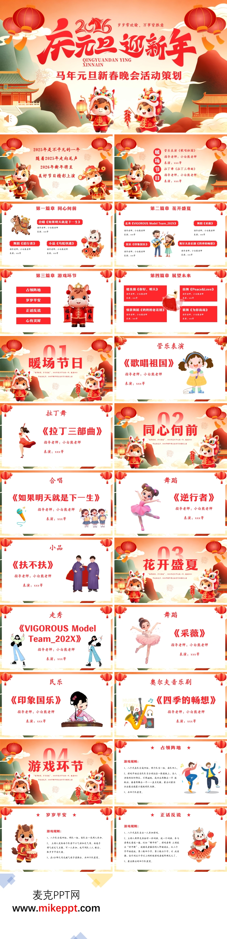 本套马年元旦新春晚会活动策划PPT课件共计30张幻灯片,以"奔腾新征程,共绘未来梦"为主题,系统性地设计了五个环环相扣的篇章,力求打造一场兼具文化内涵与时代气息的年度盛会。开篇"暖场节目"精心编排两大表演:磅礴大气的管乐合奏《歌唱祖国》用激昂旋律点燃爱国热情,瞬间凝聚全场共识;随后热情奔放的拉丁舞《拉丁三部曲》以动感节奏调动现场气氛,展现青春活力,为晚会奠定热烈欢腾的基调。 第二篇章"同心向前"强调全员参与、共庆新春的核心理念,通过三个形式各异的节目实现深度互动:深情悠扬的合唱《如果明天就是下一生》以真挚歌声传递同窗情谊与生命思考;原创舞蹈《逆行者》致敬平凡英雄,用肢体语言诠释责任担当与无畏精神;而贴近生活的小品《扶不扶》则以幽默风趣的方式引发道德思辨,在欢声笑语中传递社会正能量。此环节旨在让每一位学子都成为舞台主角,在协作与共鸣中迎接马年到来。 第三篇章"花开盛夏"作为才艺展示专场,旨在为具有特长的学生提供绽放光芒的平台,节目形式涵盖声乐、器乐、语言艺术等多元类型,既是对个人才艺的肯定,也是对校园文化繁荣景象的生动写照。第四篇章"游戏环节"则巧妙穿插互动性强、趣味性高的团队竞技项目,如传统知识竞答、默契大考验等,通过轻松活泼的形式打破年级壁垒,进一步拉近师生距离,将晚会气氛推向高潮。 压轴篇章"展望未来"以升华主题、启迪思考为要义,通过诗朗诵、情景剧等艺术表现形式,引导学生立足当下、志存高远,以昂扬姿态拥抱新岁,在万马奔腾的时代浪潮中奋楫争先,书写属于自己的青春华章。整套策划逻辑清晰、张弛有度,充分实现了娱乐性、教育性与艺术性的有机统一。