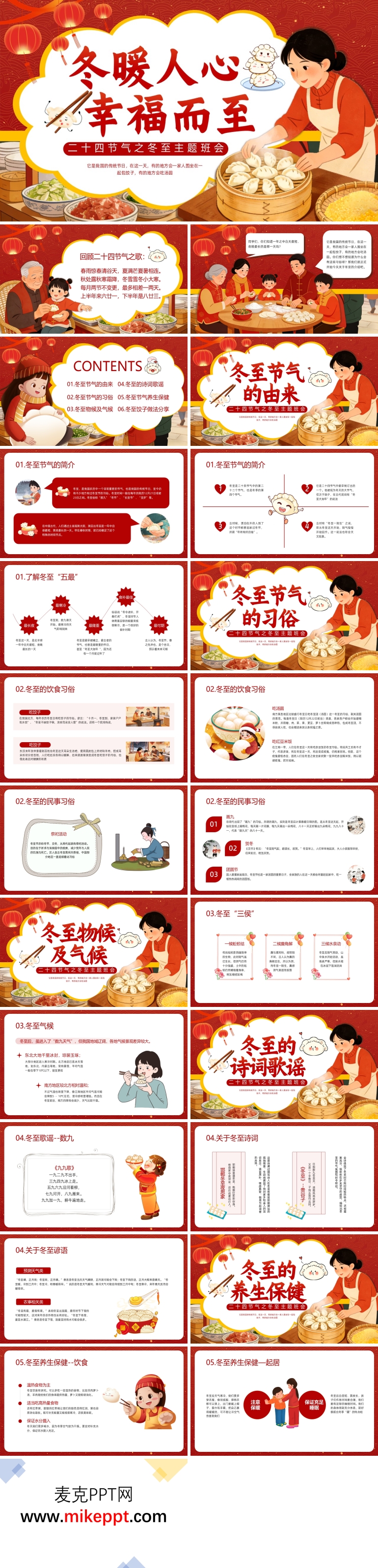 作为承载着千年文化积淀的传统节气,冬至不仅是自然界阴阳转换的关键节点,更是中华民族凝聚亲情、传承文脉的重要载体。这套精心设计的冬至班会演示文稿共28张幻灯片,以"情暖冬至,传承文化"为主线,系统构建起六维立体的文化体验课堂,旨在引导学生在沉浸式学习中触摸传统温度,厚植家国情怀。 开篇"冬至节气的由来"溯本清源,通过详实的历史脉络梳理与"冬至五最"(最早、最长、最寒、最珍、最盼)的深度解读,让学生理解为何古人视冬至为"亚岁",领悟"冬至大如年"的文化分量。第二部分"冬至节气的习俗"聚焦地域饮食智慧,从北方饺子的"消寒"寓意、南方汤圆的"团圆"象征,到江南红豆饭的辟邪习俗,配合民俗活动剪影,生动呈现"千里不同风,百里不同俗"的多元文化图景。第三部分"冬至物候及气候"则引入传统物候学视角,借"冬至三候"(蚯蚓结、麋角解、水泉动)的细致观察,培养学生敬畏自然、顺应天时的生态意识。 第四部分"冬至的诗词歌谣"以《九九歌》的韵律之美和民间谚语的哲思之光,带领学生在文学长廊中感受古人消寒祈福的生活美学。第五部分"冬至节气养生保健"结合中医"秋冬养阴"理论,传授饮食起居的实用智慧,引导学生树立顺时养生的健康理念。而压轴的"冬至饺子做法分析",则通过食材配比、包制技巧、文化内涵的层层剖析,将劳动教育与传统技艺传承有机融合,让学生在实践中体悟"一饺一世界,一味一人生"的文化意蕴。 整场班会不仅是一次节气知识的科普,更是一场文化基因的唤醒仪式。通过小组合作探究、诗词吟诵、手工包饺子等互动环节,学生在协作中增进情谊,在体验中坚定文化自信,真正理解珍惜当下、感恩亲情、传承文明的深层价值,让冬至的暖意与文化的馨香在青春的心田深深扎根。