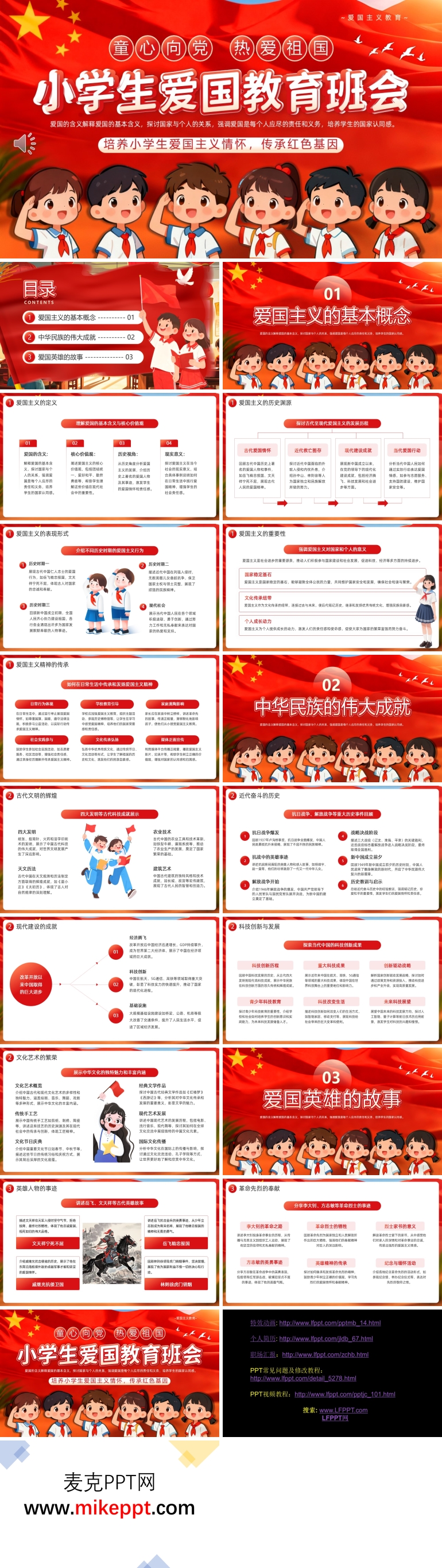 爱国主义教育是筑牢青少年精神根基的奠基工程,这套专为小学生定制的爱国教育班会PPT课件,以18张精心设计的幻灯片为载体,将宏大主题巧妙转化为儿童易懂、易感的生动课堂,系统构建起从认知启蒙到情感共鸣,再到责任担当的完整育人链条。 课程第一部分"爱国主义的基本概念"作为价值引领的起点,运用贴近生活的比喻与互动问答,引导学生理解爱国不仅是抽象的概念,更是根植于心的价值认同。通过穿越时空的叙事脉络,从屈原"长太息以掩涕兮"的 ancient 情怀,到近现代仁人志士的救国探索,让孩子们在历史长河中触摸爱国主义的发展轨迹。同时列举虎门销烟、长征精神等具体事例,将爱国行为具象化为可感知的榜样力量,最终落脚于爱国主义对国家凝聚力与个人成长方向的双重意义,在幼小心灵播撒下"有国才有家"的信念种子。 第二部分"中华民族的伟大成就"聚焦民族自豪感的培育。课件以四大发明、长城运河等古代辉煌为切入点,展现中华文明的智慧高度;继而通过抗战胜利、新中国成立等关键历史节点的情景再现,让学生理解民族独立与解放的来之不易;最后浓墨重彩地呈现改革开放以来的经济腾飞、航天突破、高铁网络等现代化成果,特别是5G技术、载人深潜等当代科技创新,形成"古有灿烂文明,今有复兴伟业"的强烈对比,激发"我为中国骄傲"的真挚情感。 第三部分"爱国英雄的故事"则通过人物故事实现情感升华。从岳飞"精忠报国"的壮怀激烈、文天祥"留取丹心照汗青"的慷慨悲歌,到李大钊面对绞刑架时的坚定从容、方志敏在狱中写下《可爱的中国》的赤诚情怀,一个个鲜活形象构筑起爱国精神的英雄谱系。课件特别设计"假如我是小英雄"的沉浸式环节,引导学生思考和平年代如何用好好学习、爱护环境、尊敬师长等实际行动践行爱国责任,将榜样力量转化为自我成长的内生动力。 整堂班会课注重儿童认知规律,将知识讲授、情感体验与行为引导有机融合,让爱国主义不再是空洞口号,而是成为小学生看得见、摸得着、做得到的精神坐标与行动指南。