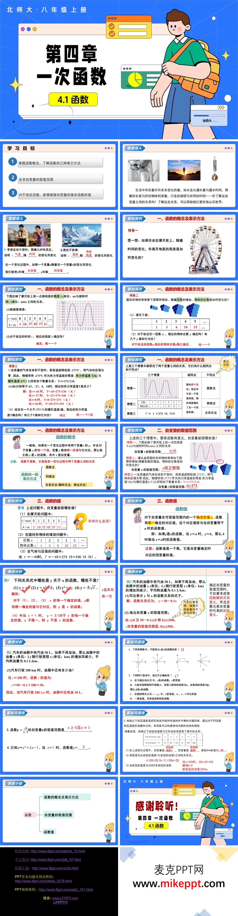 这份共二十一张幻灯片的PPT课件,专为北师大版八年级上册第四章《4.1 函数》量身定制,以“从生活现象中捕捉变化规律”为切入口,引导学生完成从“感性认识变量”到“抽象定义函数”的第一次跨越。课堂流程简洁而递进:情境导入—探究新知—典例巩固—课堂小结。 开篇“情境导入”用日常短视频串烧:自动扶梯的梯级高度与时间、加油机金额与油量、气温与海拔,三组画面同步滚动,学生边看边记录“谁跟着谁变”,教师追问“一个量确定后,另一个量是否唯一确定?”生活事例瞬间聚焦到“对应”这一核心。 “探究新知”分三步走:先给出函数描述性定义,强调“唯一对应”关键词;再借助箭头图、解析式、表格三种方式呈现同一关系,让学生直观感受函数的多元表征;最后通过“分式型、根式型、零次幂型”三类表达式,归纳求自变量取值范围的“三把钥匙”——分母不为零、偶根非负、零次底非零,每把钥匙配一道即时口答,错误答案瞬间红显,强化记忆。 “典例巩固”采用“一题多变”:同一背景“汽车匀速行驶”分别用表格、解析式、图像给出,学生抢答自变量范围并计算函数值,平板自动生成正确率柱形图,教师针对最低得分点二次讲解;随后推送两道中考真题切片,要求学生判断是否为函数关系并说明理由,实现“所学即所考”的无缝对接。 结课用“思维导图快闪”:定义、表示、求范围、求函数值四节点依次展开,学生用电子笔补充易错提示,生成班级共性记忆图;作业分两层:A层教材习题夯实基础,B层拍摄生活短视频,指出其中的自变量与函数关系并配文说明,把课堂发现带回日常。整套课件以少量幻灯片承载大容量思维,通过“视觉冲击—多元表征—即时反馈”的闭环设计,不仅让学生真正理解“函数就是对应”,更在“找范围、求值、判断关系”的实战中,为后续学习一次函数、二次函数奠定坚实的概念与技能双重根基。