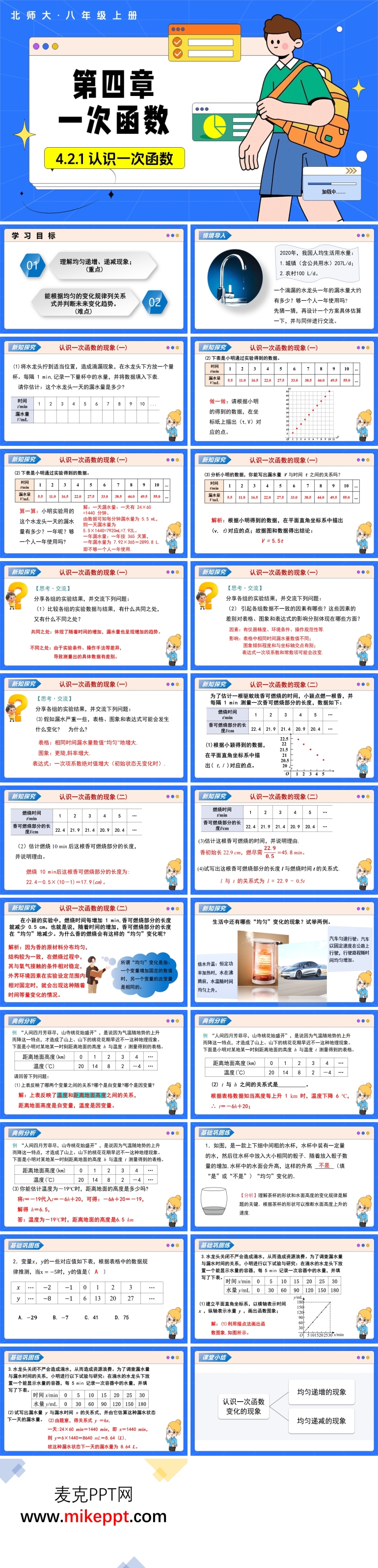 这份二十四页的演示文稿,紧扣北师大版八年级上册第四章《4.2 认识一次函数》第1课时,以“均匀变化”这一生活触感为支点,帮助学生完成从“感觉线性”到“符号一次函数”的抽象跨越。课堂流程简洁而递进:情境导入—新知探究—典例巩固—课堂小结。 开篇“情境导入”抛出贴近学生日常的手机流量案例:套餐内每月赠送1 GB,超出后按每200 MB固定资费累加,账单随使用量增加而阶梯式上升。学生边观看账单动画边记录“超用量”与“应缴费用”对应表,教师追问“每多200 MB,钱多几元?变化量固定吗?”生活实例瞬间聚焦“均匀递增”现象,激发用数学语言描述规律的需求。 “新知探究”分三步走:先让学生用表格记录流量与费用数据,计算相邻两组“差值”发现恒为固定常数;再引导用式子表示,设超出量为x,总费用y=kx+b,突出“变化量相同→k恒定”的核心特征;最后动态演示x每增加1个单位,y就增加k个单位,用GeoGebra画出对应直线,学生直观感受“均匀变化=直线上升或下降”,一次函数概念水到渠成。 “典例巩固”采用“一景多问”:同一背景“匀速骑车”分别给出表格、解析式、图像三种信息,学生抢答变化率、预测未来位置并判断趋势;平板实时呈现正确率,教师针对最低得分点即时二次讲解。随后推送两道中考真题切片,要求学生判断变化是否均匀、写出关系式并预测结果,实现“所学即所考”的无缝对接。 结课用“思维导图快闪”:均匀变化→差值恒定→一次函数→直线图像四节点依次展开,学生用电子笔补充易错提示,生成班级共性记忆图;作业分两层:A层教材习题夯实基础,B层观察家庭用电表或水表,记录读数变化并写出一次函数模型,把课堂发现带回日常。整套课件以少量幻灯片承载大容量思维,通过“生活触感—数据归纳—符号抽象—图像验证”的闭环设计,不仅让学生真正理解“均匀变化就是一次函数”,更在“列表—写式—画图—预测”的实战中,为后续学习斜率、截距及实际应用奠定坚实的概念与技能双重根基。