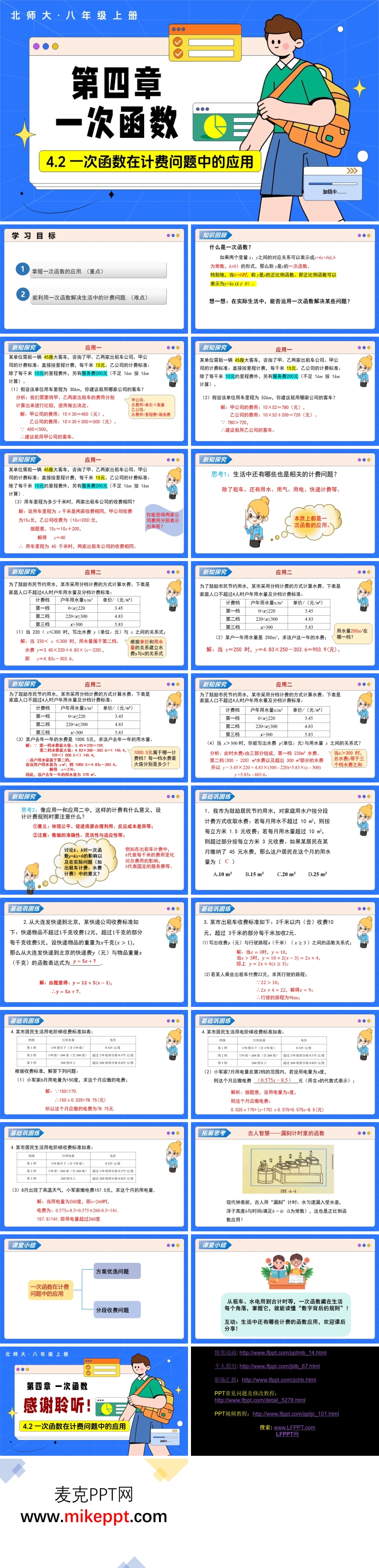 这份由二十二张幻灯片构成的PPT课件,专为北师大版八年级上册第四章《4.2 认识一次函数》第3课时“一次函数在计费问题中的应用”量身定制。课程以“复习—探究—巩固—小结”四步递进,旨在让学生把“一次函数”从纸上的符号变成生活里的“计费神器”。开篇“知识回顾”用快闪方式唤醒记忆:教师抛出y=kx+b的解析式,学生口答k与b的现实意义,随后屏幕滚动呈现“斜率即单价、截距即起步价”的口诀,为后续应用奠定概念锚点。 进入“新知探究”,课件切换到课本例题“出租车计价”:起步价10元含3公里,之后每公里2元。学生分组填表记录里程x与车费y,发现3公里后“每多1公里,多2元”,变化率恒定,教师顺势引导列式y=2(x−3)+10,化简得y=2x+4,学生亲眼看到“一次函数=计费规则”的诞生过程。紧接着头脑风暴:水费阶梯、快递超重、共享充电宝计时……每组选取一个场景,现场测量数据并写出解析式,派代表登台讲解,台下同学用点赞贴纸投票“最会省钱方案”,课堂瞬间化身“计费创意市集”。 “基础巩固”分层推进:A层直接代入解析式求费用;B层给出预算反推可行驶最大里程,需解一元方程;C层引入“两段计价”真题,要求写出分段函数并画图像,平板实时生成正确率热力图,教师针对红区错误现场“开刀”。 结课用“电梯演讲”——30秒说清一次函数在计费里的作用,弹幕滚成词云;作业分两层:A层完成教材配套练习,B层记录家庭本月电费单,按“阶梯单价”写出一次函数模型并预测下月费用,把课堂所学搬回家。整套课件通过“生活场景—数据提炼—模型建构—即时反馈”的闭环设计,不仅让学生真正理解“一次函数就是单价×数量+起步价”的计费本质,更在“算钱、省钱、比方案”的实战中,显著提升模型意识与应用能力,为后续学习分段函数、不等式及优化问题奠定坚实的方法与情感双重基础。