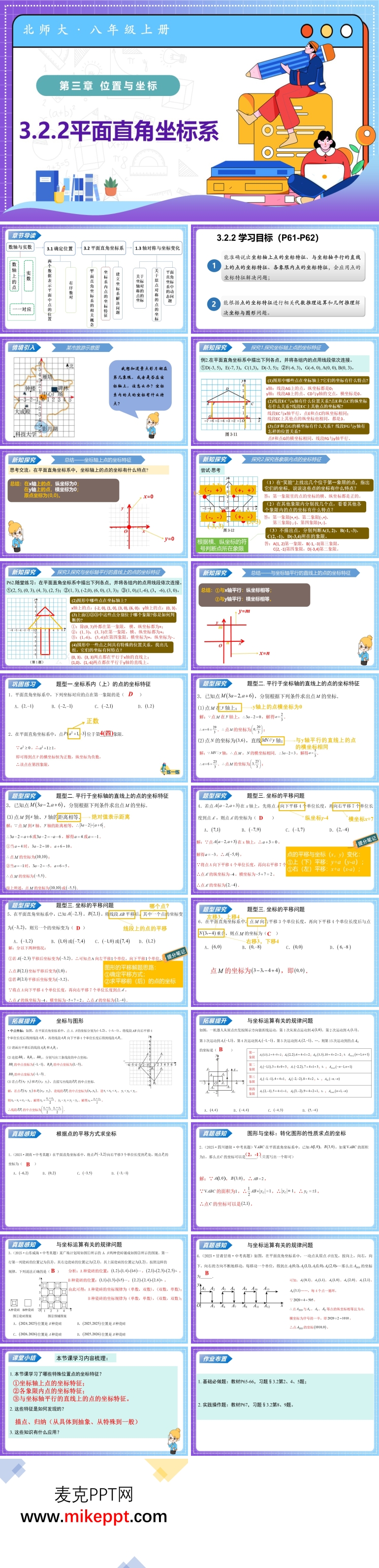 这套二十四页的PPT课件,紧扣北师大版八年级上册第三章《位置与坐标》中“平面直角坐标系”第二课时,把教学重心从“会读会描”升级为“会说会用”——让学生一眼看出点在哪里、线有什么脾气、象限藏着什么规律,并能用这些特征解决真实场景中的定位问题。课堂依旧四步走:情境导入—特征探究—巩固拓展—总结作业。 开篇“情境导入”给出一张城市旅游示意图:摩天轮、博物馆、地铁站散落在网格背景上。教师抛出问题:“如果只能告诉你坐标,你能快速把朋友带到摩天轮吗?”学生七嘴八舌报出猜测,教师追问“为什么有的数字带正号、有的带负号?零点在哪里?”生活化的导游任务瞬间把学生的注意力拉进坐标特征的世界。 “新知探究”分三条主线并行:第一,坐标轴上的点——让学生把笔尖先放在x轴上左右移动,再放到y轴上下滑动,记录坐标发现“横轴y=0、纵轴x=0”的规律;第二,象限内点——用四种颜色标记不同象限,学生口答符号口诀“Ⅰ正正、Ⅱ负正、Ⅲ负负、Ⅳ正负”,并用手势比出所在象限,形成肌肉记忆;第三,与坐标轴平行的直线——给出同一水平线上三景点坐标,学生观察纵坐标不变,归纳“平行x轴直线y=常数,平行y轴直线x=常数”,再用斜拉索道例题验证规律,完成从特征到应用的跨越。 巩固环节设置“城市寻宝”游戏:基础层给出坐标,学生判断景点所在象限;提高层给出“平行于x轴的公交线路”,要求写出另两个站点坐标;拓展层则引入中考真题,给出一条“y=5”的观光小火车轨道,要求设计一条“x=-2”的步行道与之相交,并用坐标描述交点,系统实时统计正确率,教师依据数据现场讲评,确保错误不过夜。 最后的“课堂小结”用思维导图快闪:坐标轴、象限、平行线三大特征分支逐级展开,学生口头接龙补充易错点;作业设计分层:A层完成教材配套练习,B层观察校园平面图,建立简易坐标系,用今天学到的特征描述“食堂在哪条平行于y轴的直线上”,并说明理由,将课堂所学迁移到真实环境。整套课件通过“城市地图—特征归纳—即时应用”的闭环,不仅让学生真正理解“点的坐标藏着位置密码”,更在“看坐标、说特征、用规律”的丰富体验中,深刻体会数形结合与分类讨论的数学思想,为后续学习函数图像、几何变换奠定坚实的观察与思维双重基础。