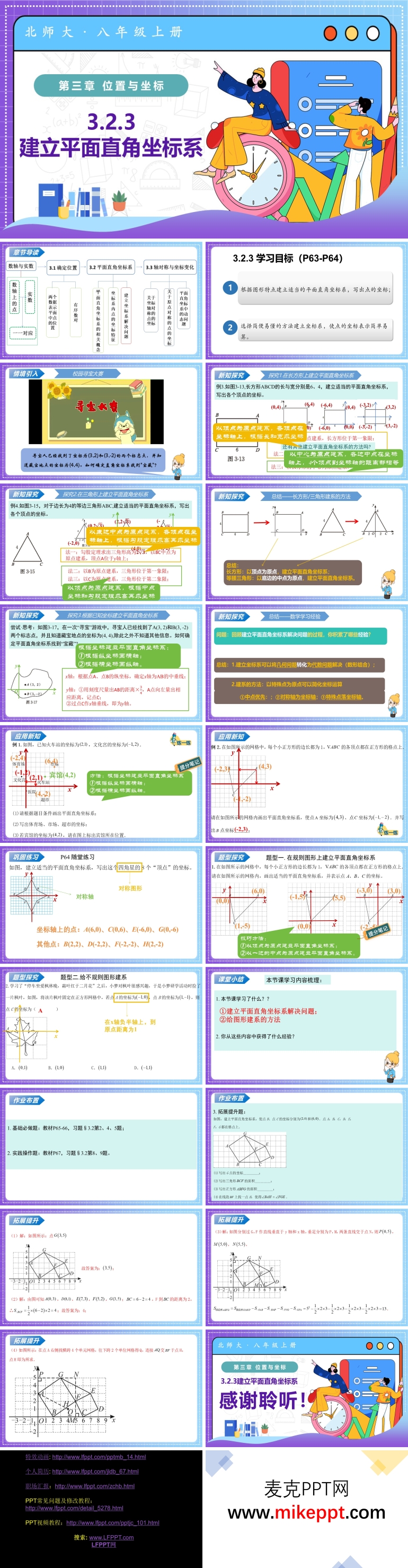 这份共二十一页的PPT课件,紧扣北师大版八年级上册第三章《位置与坐标》中“平面直角坐标系”第三课时,把教学焦点从‘会读坐标’升级为‘会建坐标’——让学生依据图形特点,秒选最省事的原点与轴向,使点的坐标写得快、算得快、看得懂。课堂依旧四段推进:情境导入-新知探究-巩固提升-总结作业。 开篇“情境导入”抛出校园寻宝大赛海报:学校平面图散落着三处“宝藏”,任务单只给出图形尺寸,没有现成坐标系。教师提问:“想最快写出宝藏位置,第一步该做什么?”学生异口同声“自己建坐标!”生活化任务瞬间激活建系需求。 “新知探究”分三条主线: 1. 长方形建系——给出长10宽6的矩形,学生分组讨论:把原点放在左下角、中心还是左上角?各写出一组顶点坐标并比较“谁的最简”,最终发现“原点置左下,轴与边重合”坐标全是正数,计算最方便; 2. 三角形建系——给出任意锐角三角形,引导学生把原点放在某顶点,让一条直角边与x轴重合,瞬间把斜边坐标转化为简单的“底+高”模式,体会“对称构图”带来的简洁; 3. 已知坐标反推建系——给出A(2,3)、B(5,1)、C(0,0)三点,要求还原坐标系位置,学生通过平移与旋转比对,理解“坐标系可动,图形相对位置不变”的相对性思想。 巩固环节设置“建系大比拼”:基础层给出等腰梯形,要求选择最简原点并写出四顶点坐标;提高层给出菱形,鼓励用两种不同建系方法各写一组坐标,比较哪种更优;拓展层引入中考真题,给出不规则四边形,要求在网格纸内设计坐标系使所有坐标为整数,系统实时拍照上传,教师依据简洁度现场评分,优胜组获得“坐标建筑师”电子勋章。 结课用“三字诀”快闪:先定点、再定轴、后定号,学生口头接龙补充易错点;作业分两层:A层完成教材配套练习,B层测量自己书桌的长与宽,设计两种建系方案并写出四角坐标,说明优选理由,把课堂策略带回家。整套课件通过“任务驱动-对比优化-即时展示”的闭环,不仅让学生真正理解“坐标系是人为工具,建得巧才能算得妙”,更在“一动笔就简洁、一思考就优化”的反复体验中,深刻体会数学的简化思想与策略意识,为后续函数图像、几何变换及解析综合奠定坚实的方法与信心双重基础。
