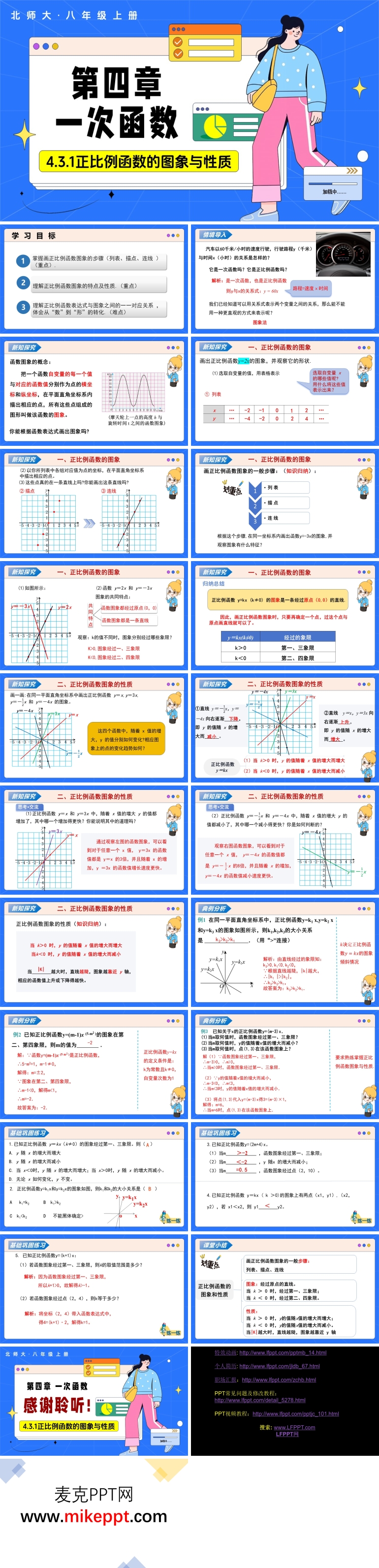这套由二十二张幻灯片构成的教学课件,专为北师大版八年级上册第四章《一次函数的图像》第一课时“正比例函数的图像与性质”量身定制,旨在让学生经历“表达式→表格→描点→连线→观察→归纳”的完整过程,真正理解“k值决定直线姿势,原点必过”的图像本质。课堂依旧四段推进:情境导入—新知探究—典例巩固—课堂小结。 开篇“情境导入”给出汽车仪表盘特写:指针定格在80 km/h,屏幕动态显示行驶时间t与路程s同步增加。教师提问:“除了列表、写式,还能怎样一眼看出s=80t的变化趋势?”学生脱口而出“画图像”,生活经验瞬间对接“图像法”必要性,引出本节核心任务。 “新知探究”分三步走:先回顾函数图像定义——“所有有序点(x,y)的集合”;随后聚焦正比例y=kx,学生分组填表、描点、连线,发现无论k为正为负,图像都是一条经过原点的直线;接着用GeoGebra动态拖动k值,观察直线旋转,归纳出“k>0,过一、三象限,上升;k<0,过二、四象限,下降;|k|越大,直线越陡”的性质口诀,实现“数形同步”。 “典例巩固”采用“一题三问”:给出y=2x,先列表描点验证直线,再求x=1.5时的函数值,最后判断点(-2,-4)是否在图像上,平板实时统计正确率,教师针对红区错误现场“开刀”;随后推送中考真题切片,要求根据图像写解析式并比较k值大小,实现“所见即所考”。 结课用“思维导图快闪”:列表→描点→连线→观察→归纳五节点依次展开,学生口头接龙补充易错点;作业分两层:A层完成教材配套描点画图,B层拍摄家中水龙头流水视频,记录时间与接水量,验证是否为正比例并画图像,把课堂发现带回家。整套课件通过“动态生成—即时观察—对比归纳”的闭环,不仅让学生真正理解“解析式与图像一一对应”,更在“画一画、看一看、比一比”的亲历中,深刻体会数形结合思想,为后续学习一次函数平移、斜截式及实际应用奠定坚实的图像与性质双重基础。