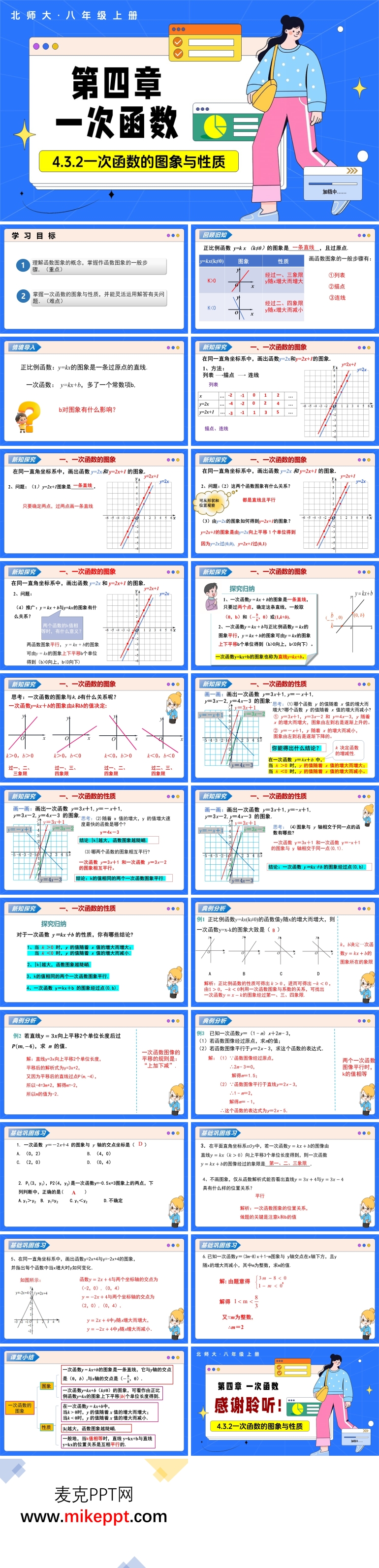 这份由二十三张幻灯片构成的教学课件,紧扣北师大版八年级上册第四章《一次函数的图像》第二课时,以“从特殊到一般”为线索,引导学生在正比例函数的基础上进一步探究一次函数y=kx+b的图像特征与性质,实现“会画图、能识图、会用图”的三重目标。课堂流程依旧五步递进:回顾旧知—情境导入—新知探究—典例巩固—课堂小结。 开篇“回顾旧知”用动态直线快闪:正比例函数图像过原点,k决定上升或下降,学生边口述边用手势比斜率,教师顺势板书“列表—描点—连线”三步骤,为后续探究奠定方法基础。紧接着“情境导入”抛出共享单车计费场景:起步价1元含前2公里,之后每公里0.5元,学生列出解析式y=0.5x+1,发现“不再过原点”,自然产生“新图像长什么样”的疑问。 “新知探究”分三步走:先在同一坐标系内分组画出y=2x、y=2x+3、y=2x-2,观察发现三条直线平行,b值让图像上下平移;再改变k值正负,对比y=2x+1与y=-2x+1,归纳k>0上升、k<0下降、b定交点(0,b)的性质口诀;最后用GeoGebra动态拖动k与b,实时预览直线旋转与平移,学生直观感受“斜率定方向,截距定位置”的数形对应。 “典例巩固”采用“一题三问”:给出y=-3x+4,先列表描点验证直线,再求x=-1时的函数值,最后判断点(2,-2)是否在图像上,平板实时统计正确率,教师针对红区错误现场“开刀”;随后推送中考真题,要求根据图像写解析式并比较函数值大小,实现“所见即所考”。 结课用“思维导图快闪”:k定方向、b定位置、两点定直线三节点依次展开,学生口头接龙补充易错点;作业分两层:A层完成教材配套画图与判断,B层测量家中水龙头放水时间与接水量,验证是否为一次函数并画图像,把课堂发现带回生活。整套课件通过“动态对比—即时观察—口诀归纳”的闭环,不仅让学生真正理解“解析式与图像一一对应”,更在“画一画、看一看、比一比”的亲历中,深刻体会数形结合思想,为后续学习一次函数应用、与方程不等式综合奠定坚实的图像与性质双重基础。