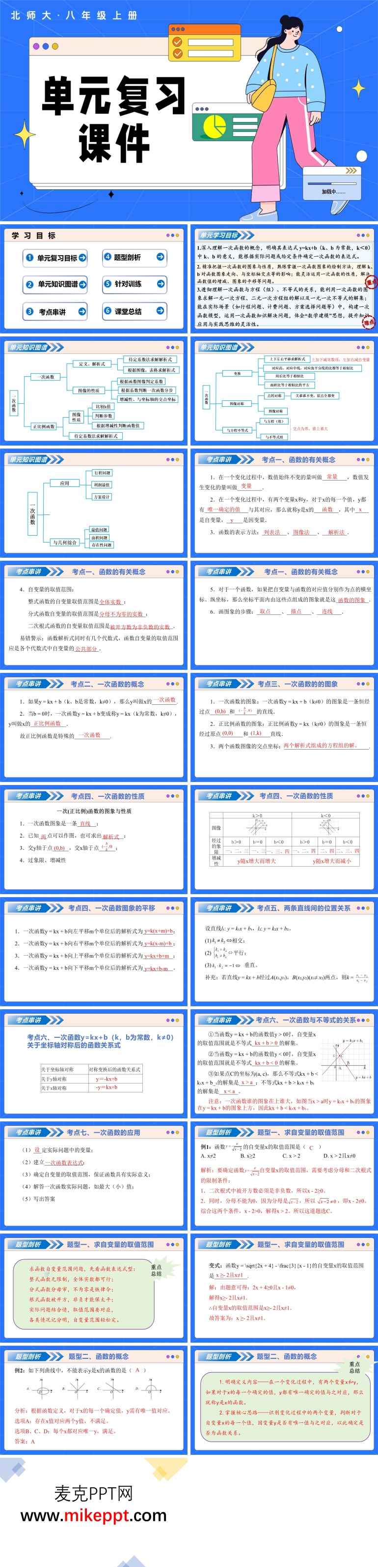 这份共七十九页的复习课件,为北师大版八年级上册第四章《一次函数》量身定制,以“框架—缺口—补缺—实战”四部曲,帮学生在有限时间内把零散知识织成网、把易错点变得分点。课堂沿“六步闭环”推进:目标导航—图谱建网—考点速通—题型破拆—针对训练—总结提升。 开篇“单元复习目标”用双色雷达图直击要害:重点侧写明“能辨一次函数、会画图像、会用性质解实际问题”;难点侧聚焦“含参解析式求范围、图像平移与几何综合”,让学生抬头便知复习靶心。 “单元知识图谱”以可缩放思维导图呈现三大主干——“概念”下设定义、自变量取值、与正比例区别;“图像与性质”拆成斜率k、截距b、平移规律、两直线位置关系;“应用”涵盖计费、行程、方案比较、交点决策。节点留空,学生用电子笔现场填充典型错题或提醒,教师一键保存,生成“班级复习云图”,实现知识个性化再建构。 “考点串讲”采用表格+动画双通道:左侧列考点,右侧配“易错闪电标”,如“k相同必平行,b不同才相错”“平移口诀:上+b下-b,左+x右-x”等,每点配3秒Gif演示,30秒过完一个考点,既高效又吸睛。 “题型剖析”精选月考失分高频五类:判断一次函数、求参数范围、图像平移、交点实际问题、方案择优。每类配“母题”+“子题”,用“错因→正解→变式”三段式拆解,学生用点赞贴投票“最惨痛病例”,在笑声中警醒。 “针对训练”分层推送:A层在线判断快速抢答,系统即时红绿反馈;B层给出“阶梯水费”情境,要求写分段解析式并画图像;C层引入中考真题,要求用两种方法求“两车相遇又相距”的时刻,平板实时生成“掌握度曲线”,教师依据数据现场开“微门诊”。 结课“课堂总结”用30秒“电梯演讲”——每人说一个今天补齐的知识漏洞,弹幕滚成词云;作业分两层:A层完成教材单元复习题,B层拍摄生活视频,找出“一次函数”场景,测数据、写模型、做预测,把复习成果带回家。整套课件通过“目标定向—图谱织网—错因曝光—精准训练”的闭环,不仅让学生把“辨式、画图、用性、建模”做得又快又准,更在“自查—互学—展示”的反复体验中,提升合作意识与策略思维,为后续二次函数、综合实践奠定坚实的方法、能力与信心三重基础。