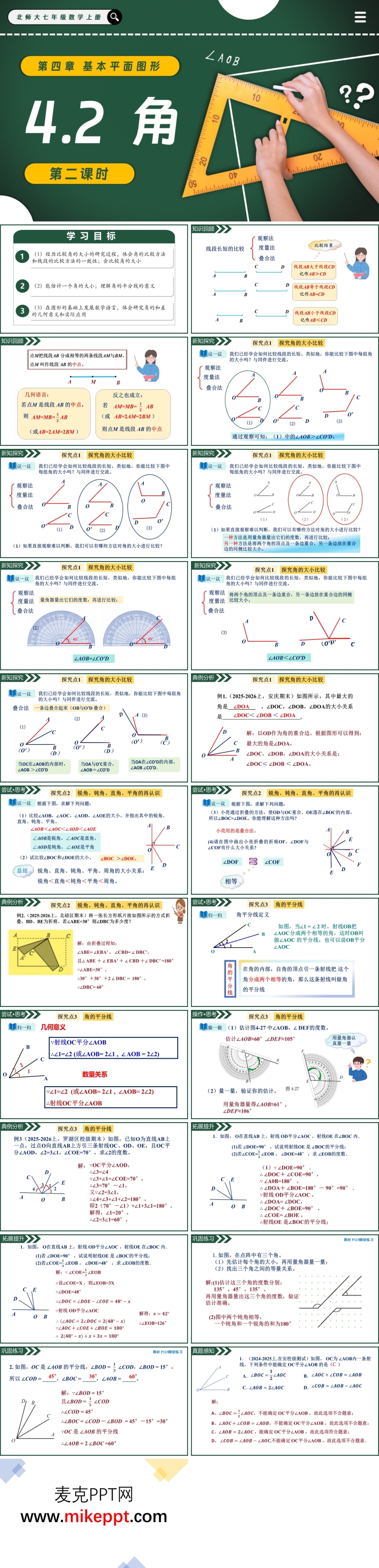 这是一套专为北师大版七年级数学上册第4章“角”中第2课时设计的PPT课件,共包含32张幻灯片。本节课的核心目标是帮助学生深入掌握角的度量单位,理解度、分、秒之间的换算关系,并能熟练进行简单的换算。同时,通过本节课的学习,让学生感受到数学与生活的紧密联系,激发他们学习数学的兴趣。此外,在小组合作探究的过程中,培养学生的合作交流意识和严谨的学习态度,使他们在数学学习中不仅掌握知识,还能提升综合素质。 该套PPT的设计思路清晰,层次分明。首先,通过回顾线段长短的比较方法以及绘制线段中点的方法,帮助学生建立起与角的比较和度量相关的知识基础。这种复习导入的方式,能够有效唤醒学生已有的知识经验,为后续学习角的大小比较等内容做好铺垫。 接着,PPT引导学生探究角的大小比较方法,帮助他们认识锐角、钝角、直角和平角等不同类型的角,并深入理解角的平分线的概念。通过直观的图形展示和逐步引导,学生能够更加清晰地理解这些概念,从而为后续的计算和应用打下坚实的基础。 在知识讲解的基础上,PPT通过典例分析,针对具体问题进行详细剖析。这种以实际问题为导向的教学方式,能够帮助学生将理论知识与实际应用相结合,提高他们解决实际问题的能力。学生在分析和解决这些问题的过程中,不仅能够加深对知识点的理解,还能培养他们的逻辑思维能力和数学素养。 此外,该套PPT还精心设计了巩固练习和真题感知两个环节。通过多样化的练习题,学生可以进一步加强对知识点的理解和应用,巩固所学内容。同时,真题感知环节让学生提前接触中考真题,了解考试方向和题型特点,增强他们的应试能力。 总之,这套PPT课件内容丰富,结构合理,既注重基础知识的传授,又强调学生能力的培养,是一套非常实用的教学资源,能够有效辅助教师开展教学活动,帮助学生更好地掌握本节课的知识要点,提升数学学习效果。