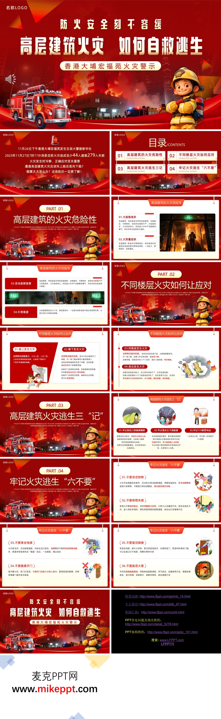 近期香港大埔宏福苑的火灾事故,再次将高层建筑的消防安全问题推至公众视野前沿。作为一座以高密度发展闻名的国际都市,香港在建筑技术、城市管理等方面的成熟度向来备受认可,然而当面对超高层建筑火灾这一全球性难题时,即便是这样的先进城市也显得格外脆弱。这一现实警示我们:火灾风险不分地域与实力,唯有掌握扎实的应急知识,才能在危急时刻赢得生机。正因如此,一套系统性的消防安全教育资料显得尤为重要。 这份长达16页的警示专题PPT,正是针对当前高层建筑火灾频发的严峻形势而精心编制,旨在提升全民的火灾防范意识与自救互救能力。其内容架构清晰,层层递进,从理论认知到实践操作,全方位构筑起一道安全防线。 开篇首先剖析高层建筑独特的火灾危险性:这类建筑内部结构复杂,功能分区密集,导致潜在的火险隐患点多面广;一旦发生火情,由于竖向井道、风道等形成的“烟囱效应”,火势会呈现垂直蔓延的加速度,速度远超普通建筑;同时,消防装备的作业高度受限,外部救援力量难以快速抵达核心区域,扑救难度极大;而人员疏散路径长、容量有限,极易引发拥堵踩踏,安全撤离可谓困难重重。 紧接着,第二部分聚焦实战场景,针对不同楼层起火给出差异化应对策略。若是楼上起火,首要任务是立即向下疏散,切勿贪恋财物或观望等待;若楼下已成火海,则需冷静判断,封闭门窗固守待援,或视情况向楼顶平台转移;同楼层突发火情时,应迅速判断逃生路线,优先考虑未被火势波及的楼梯间撤离,必要时破窗呼救。 第三部分提炼出高层建筑逃生的三大核心要领:其一,务必用湿毛巾或防毒面罩捂住口鼻,低姿匍匐前行,最大限度减少有毒烟气吸入;其二,撤离时尽量选择靠近主干道或开阔地带的方向,便于被救援人员发现;其三,第一时间拨打火警电话,清晰报告被困位置与火情信息,争取黄金救援时间。 最后,这份材料还特别归纳了火灾逃生中的“六不要”行为准则:不要乘坐电梯、不要盲目跳楼、不要贪恋财物、不要逆人流而行、不要躲入死角、不要忽视日常演练。这些看似简单的警示,实则是无数次血泪教训的结晶。 综观全篇,这套PPT不仅是对香港火灾事件的深刻反思,更是一份面向普通民众的实用生存指南。它提醒我们,安全防护永远不能寄望于外部救援,唯有将应急知识内化于心、外化于行,才能在灾难来临时保持清醒,做出正确选择,守护自己与他人的生命安全。