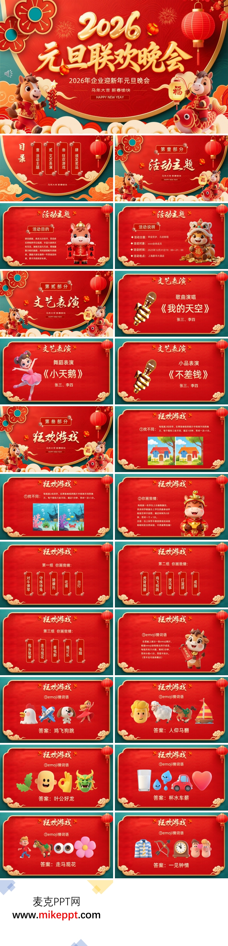 辞旧迎新之际,一场精心策划的视听盛宴往往能为崭新的征程注入蓬勃朝气。这套专为2026马年元旦量身定制的迎新春联欢晚会演示文稿,以足足33页的饱满篇幅,将喜庆氛围与组织文化深度融合,既是对过往岁月的温情作别,更是对未来时光的昂扬宣言。 元旦晚会作为年度文化盛典,早已超越单纯娱乐的范畴。它不仅是参与者展示才艺、绽放光彩的绚丽舞台,更是组织凝聚人心、涵养精神家园的重要载体。通过这场盛会,团队成员得以在欢声笑语中增进情谊,在协作互动中深化默契,共同营造出朝气蓬勃、积极向上的集体氛围。更重要的是,晚会承载着传递正能量的使命,激励全体成员以饱满热情拥抱新年,为组织发展树立更高远的目标,勾勒更宏伟的蓝图。 这份演示文稿在结构上匠心独运,划分为四大核心板块。开篇的"活动主题"板块开宗明义,清晰阐明晚会的主旨立意、参与对象、精确时间与地点安排,为整场活动奠定基调。紧随其后的"文艺表演"板块无疑是晚会的华彩篇章:从余音绕梁的歌曲演唱,到动感十足的舞蹈节目,再到诙谐深刻的小品表演,多元艺术形式交相辉映,既彰显个人才华,又体现团队风采。 而第三板块的"狂欢游戏"则将现场气氛推向高潮。"找不同"考验观察力,"你画我猜"激发创造力,"猜词语"比拼反应速度,"谁是卧底"则锻炼逻辑推理与表达能力。这些精心设计的互动环节打破部门壁垒,让每一位参与者都能沉浸其中,在轻松愉悦中拉近彼此距离。 最后,"颁发奖品"环节为这场盛会画上圆满句号。它不仅是对表演者与优胜者的肯定与嘉许,更象征着组织对每一份付出的珍视。当获奖者在掌声中接过荣誉,激励的不仅是个人,更是整个团队的向心力与归属感。从主题确立到才艺展示,从游戏互动到荣誉表彰,这套PPT以完整的叙事逻辑,将一场元旦晚会升华为一次深刻的文化浸润与精神洗礼。