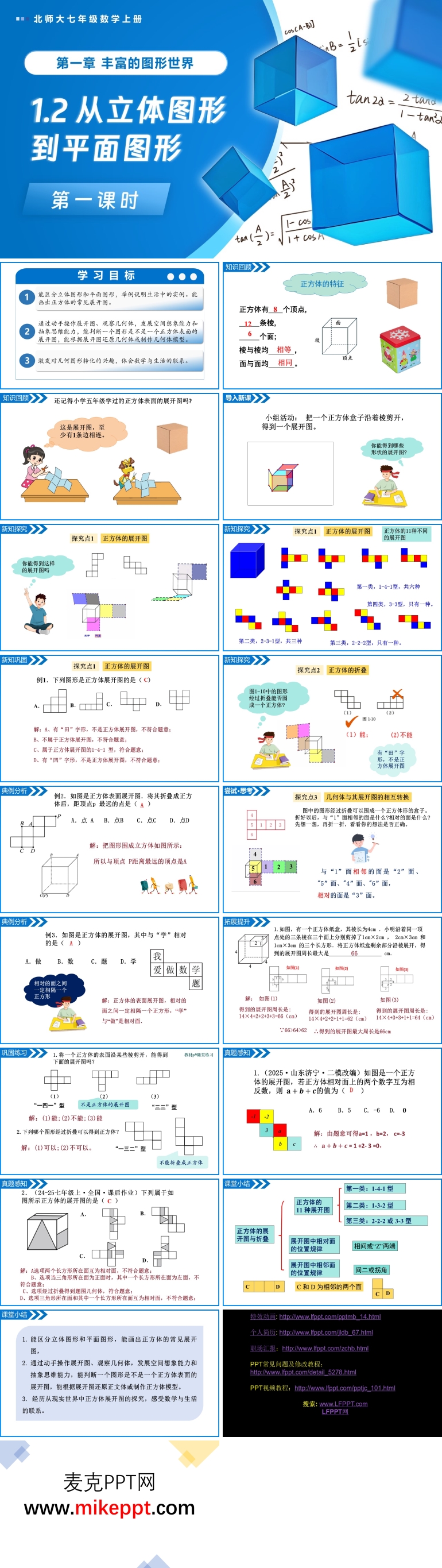 这是一套专为北师大版七年级数学上册“从立体图形到平面图形”第一课时设计的PPT模板,通过PowerPoint软件精心制作,共包含18张幻灯片。本节课的核心目标是引导学生能够区分立体图形和平面图形,并独立画出正方体的常见展开图。通过本节课的学习,学生将初步建立立体图形与平面图形之间的联系,提升他们的空间想象能力和几何直观能力。 该PPT模板从五个部分展开对本课时内容的讲解,结构清晰、内容丰富。第一部分是知识回顾。在这一部分,PPT引导学生回顾正方体的基本特征,包括正方体的面、棱和顶点的数量及其特点。通过复习正方体的特征,帮助学生巩固已有的知识基础,为后续学习正方体的展开图做好铺垫。这种复习导入的方式能够帮助学生建立起新旧知识之间的联系,使学习更加连贯。 第二部分是新课导入。这一部分通过一个小组活动引入新课。PPT展示一个正方体盒子,引导学生沿着棱剪开,得到一个展开图。教师通过引导学生观察和分析展开图,帮助学生初步理解立体图形与平面图形之间的关系。例如,通过讨论展开图的形状和组成,引导学生思考为什么展开图可以重新折叠成正方体。这种小组活动不仅激发了学生的学习兴趣,还培养了他们的动手能力和合作意识。 第三部分是新知探究。这是本节课的核心环节,PPT通过丰富的图示和动画演示,引导学生深入探究正方体的展开图。首先,通过展示正方体展开图的多种常见形式,帮助学生理解正方体展开图的多样性。接着,引导学生分析展开图的结构,例如哪些面是相对的,哪些面是相邻的。此外,PPT还通过动画演示正方体的折叠过程,帮助学生理解几何体与其展开图之间的相互转换。通过这些直观的演示和讲解,学生能够清晰地理解正方体展开图的特点,进一步提升他们的空间想象能力。 第四部分是拓展提升和巩固练习。在这一部分,PPT设计了一系列与本节课内容相关的练习题,包括选择题、填空题和作图题。这些练习题旨在帮助学生巩固本节课所学的新知识点,如正方体展开图的画法和几何体与展开图的转换。通过完成这些练习,学生可以更好地掌握所学知识,并检测自己的学习效果。拓展提升环节还设计了一些更具挑战性的问题,引导学生运用所学知识解决实际问题,进一步提升他们的思维能力和应用能力。 第五部分是课堂小结。这一部分对本节课的重点内容进行系统梳理,帮助学生回顾立体图形与平面图形的区别,正方体展开图的特点以及几何体与展开图之间的相互转换方法。通过总结,学生能够清晰地了解本节课的学习目标和成果,进一步巩固所学知识。课堂小结部分还鼓励学生分享自己的学习心得和体会,帮助他们更好地总结经验,提升学习效果。 总的来说,这套PPT模板设计科学合理,内容丰富多样,形式生动形象。它通过知识回顾、小组活动导入、详细讲解、练习巩固和课堂小结等环节,系统地引导学生学习从立体图形到平面图形的转化,特别是正方体展开图的画法和特点。这种教学设计不仅注重知识的传授,更注重学生能力的培养,能够有效激发学生的学习兴趣,提升他们的空间想象能力和几何思维能力,是一套非常实用的教学资源。