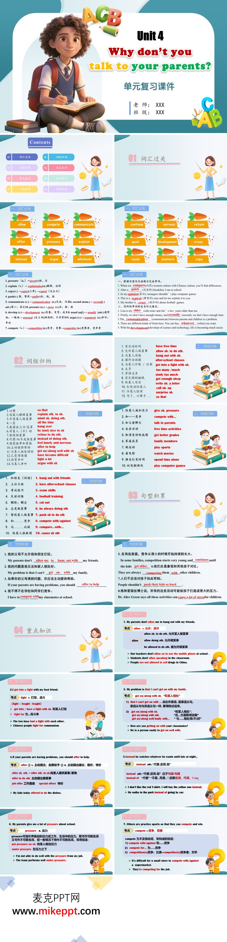 这套单元复习课件紧扣人教版八年级下册英语Unit 4 "Why don't you talk to your parents?"的整体设计,以“词汇-词组-句型-知识重点”四级递进的方式,将零散的知识点串联成网,帮助学生在短时间内完成系统回顾与深度巩固。开篇先用醒目的单元标题和授课信息锁定复习范围,随后以“Contents”目录清晰切分四大模块:词汇过关、词组归纳、句型积累和重点知识,使学生能够像检索目录一样快速定位自己的薄弱区域,实现分块突破。 在内容编排上,课件先用表格加例句的形式对核心词汇(如offer, pressure, explain)进行词性、中文释义、搭配示例的三栏对比,帮助学生回忆词义的同时复现搭配语境;接着以“take the test, communicate with, be afraid of”等高频短语为切入点,通过中英文互译和填空练习,强化固定搭配的熟练度;句型模块则集中梳理“Why don't you...? / How about...? / You should...”等功能建议句型,并辅以情景替换练习,让学生在短时间内复用语言功能。最后的“重点知识”用思维导图方式呈现“提建议-接受-拒绝”的应答策略,配合although, so that, until等连词的用法小结,实现语用与语法的双重复习。 视觉风格上,PPT以清新的蓝绿色为主色调,营造出专注而平静的复习氛围;顶部中央背着书包、手持书本的卡通男孩形象,活泼地点明“学生复习”场景;各板块标题辅以不同明快色块区分,使页面层次分明、重点突出。整体版面整洁,图文比例得当,既符合初中生审美,又兼顾知识密度与可读性,是一套设计规范、内容聚焦、实用性强的单元复习教学课件,为教师开展高效复习、学生自主查漏补缺提供了得力的工具支持。